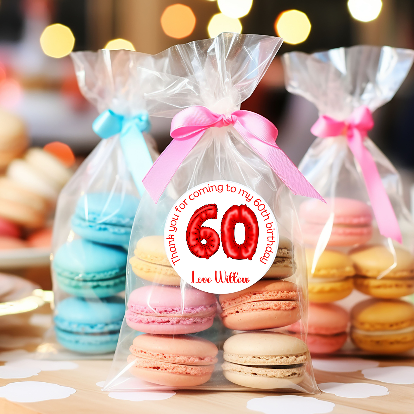 Add a personal touch to your party favours with our 60th "Thank You for celebrating with me" stickers. These adorable stickers can be personalised with your name making them the perfect way to express gratitude to your guests. Stick them on favour bags, gift boxes, or envelopes for a heartfelt touch. Say thank you in style with our personalised stickers!