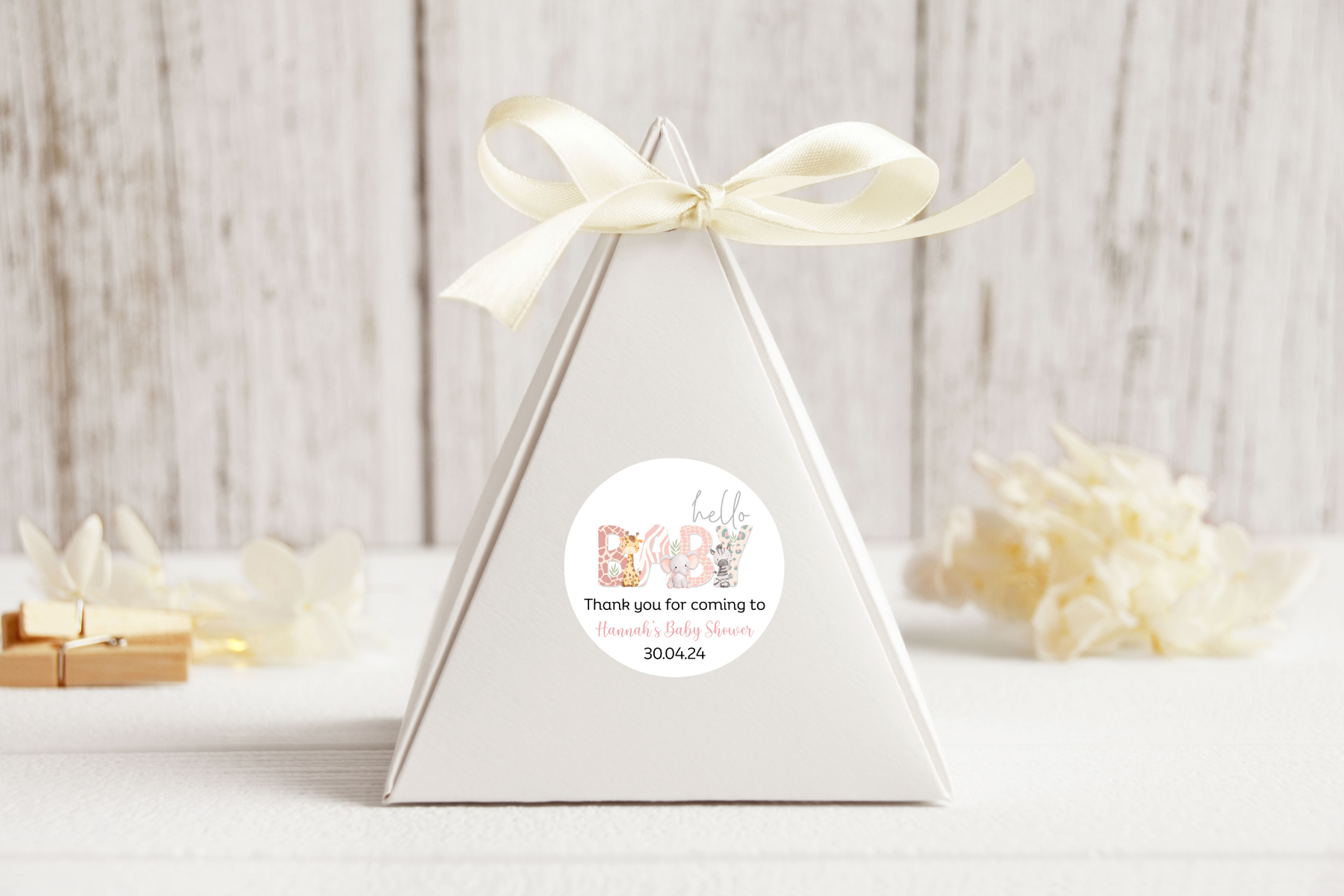 Add a personal touch to your party favours with our Hello Baby! Baby shower stickers. These adorable stickers can be personalised with your name making them the perfect way to express gratitude to your guests. Stick them on favour bags, gift boxes, or envelopes for a heartfelt touch. Say thank you in style with our personalised stickers!