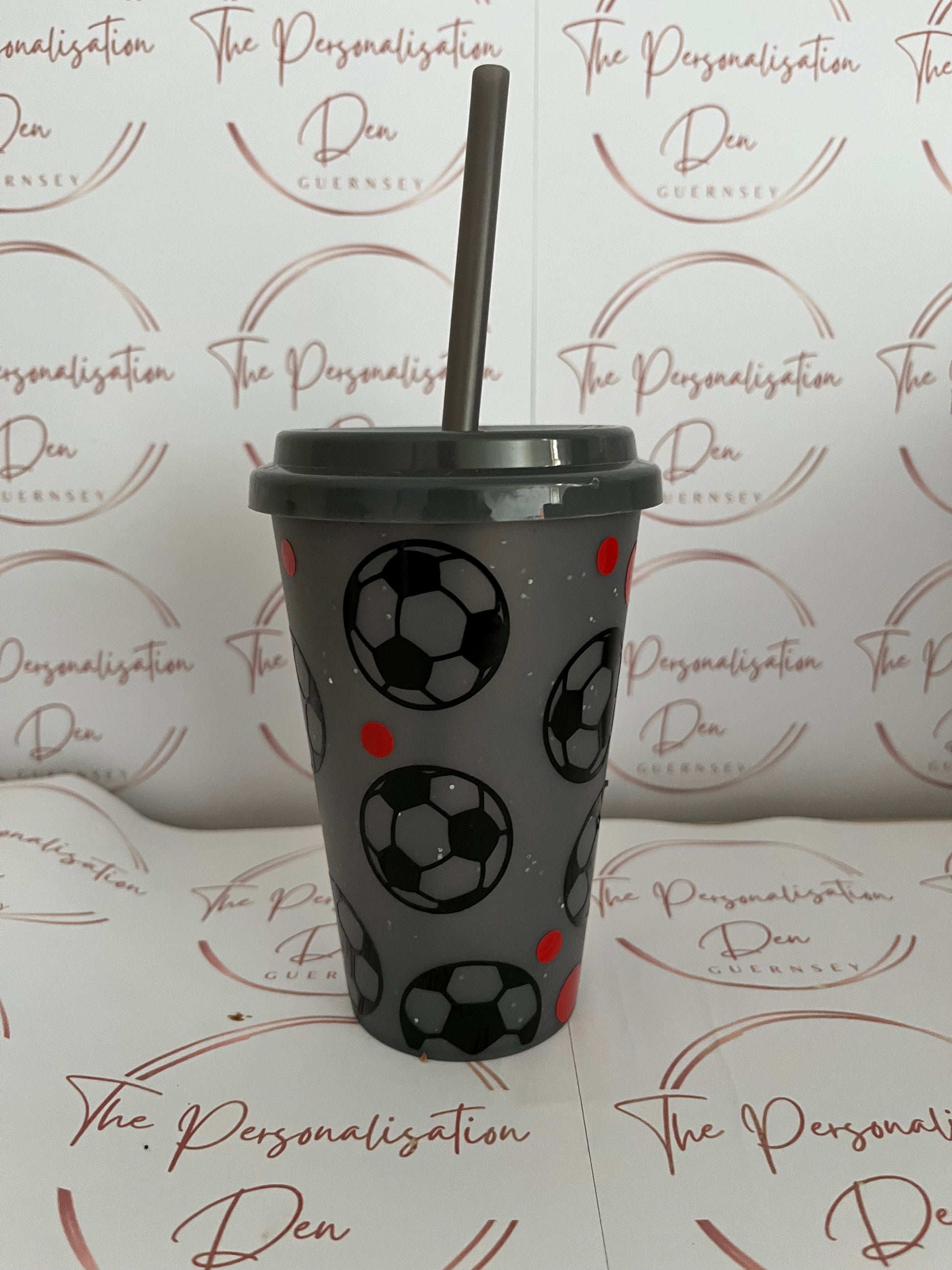 12oz Grey cold cup. This cup features a football design.