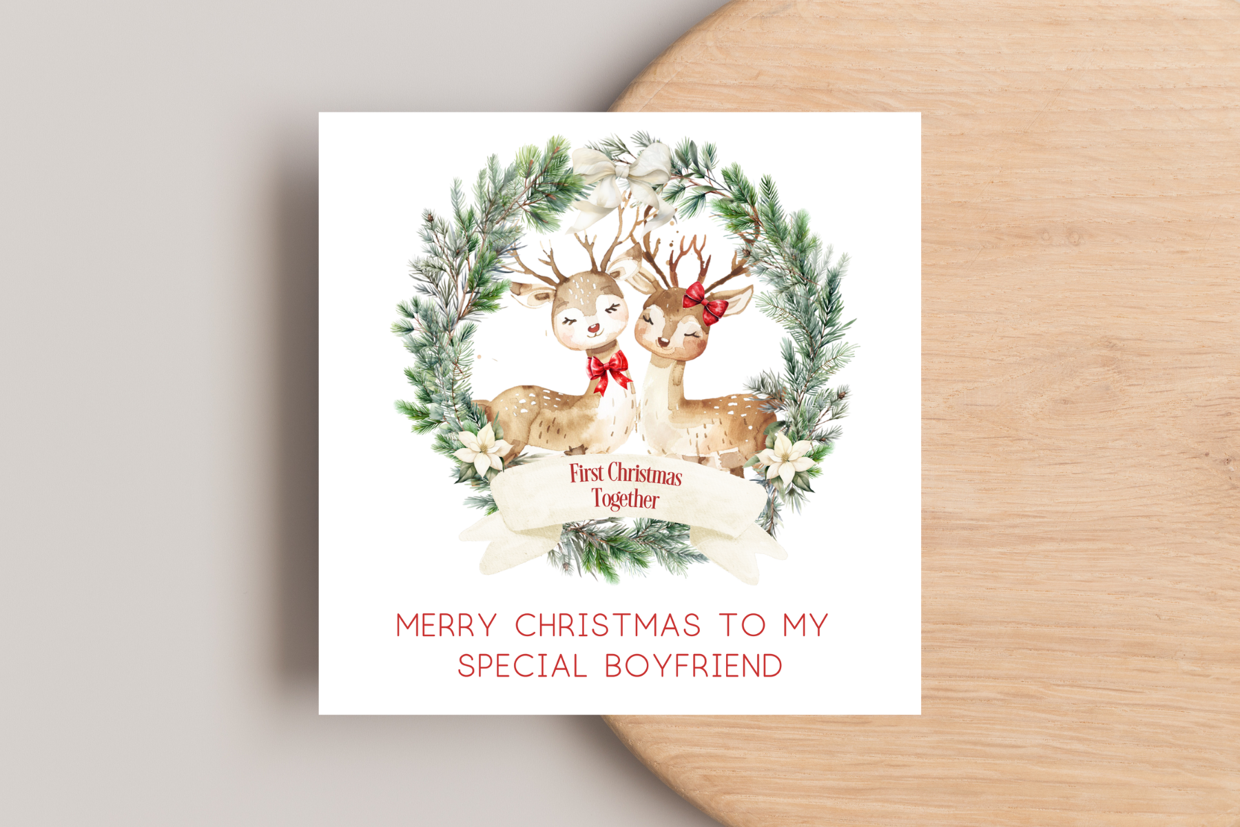 Celebrate your first Christmas together with this beautiful Reindeer Couple Christmas Card, designed specifically for your boyfriend or girlfriend. Show them how special they are with this unique card, made with love and perfect for spreading holiday cheer. Made for couples in love, this card will surely touch their hearts.