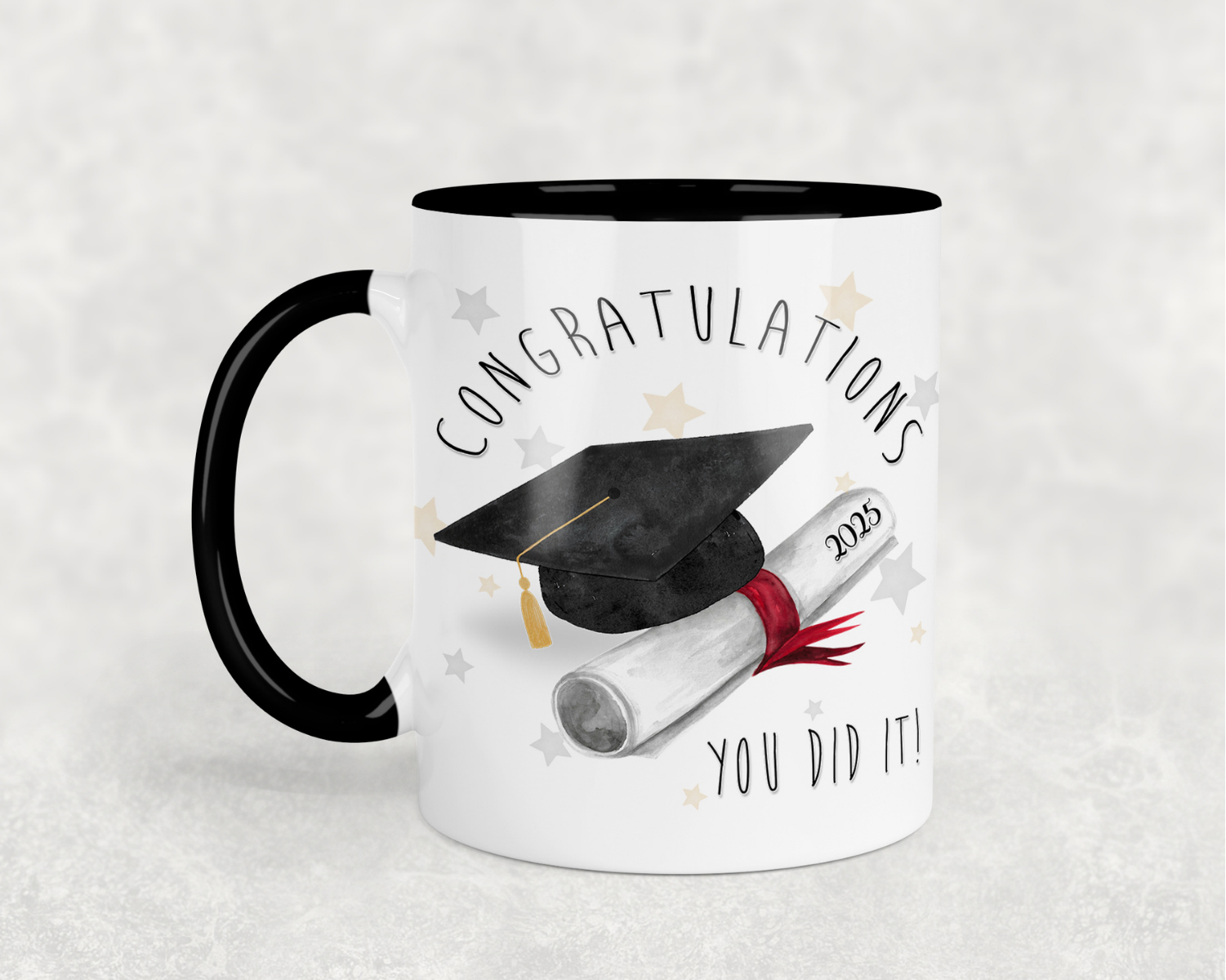 Celebrate academic achievements with our playful Congratulations 2025 Graduation Mug! Featuring a sleek black inner and matching handle, this mug showcases a charming cap and scroll design—perfect for toasting to new beginnings. Gift your graduate something they'll actually use while reminiscing about their scholarly triumph!