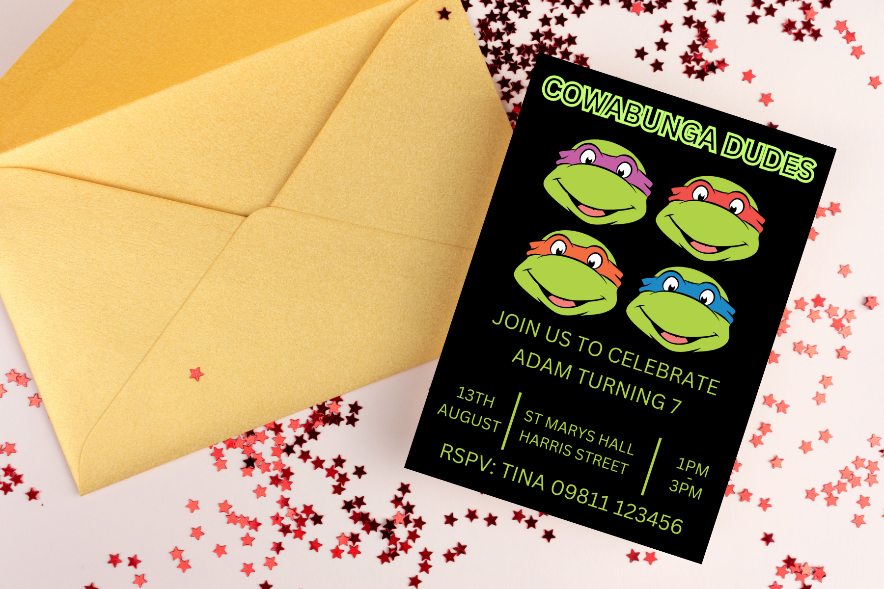Introducing our exclusive Personalised Editable Teenage Mutant Ninja Turtle Party Invitation. Personalise every detail to make it truly your own. Perfect for a premium TMNT party experience that you and your guests will remember forever.