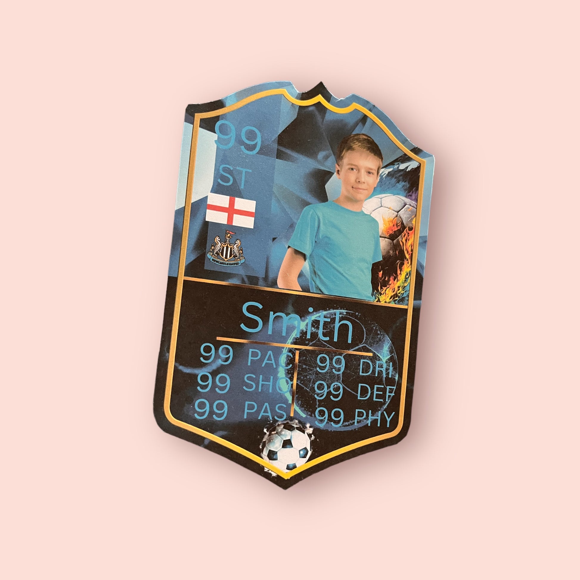 Celebrate your love for football with our personalized Fifa card cake topper. This topper includes your name, stats, favorite team, and nationality. Perfect for any football fan, make your cake stand out with this unique and customizable topper.
