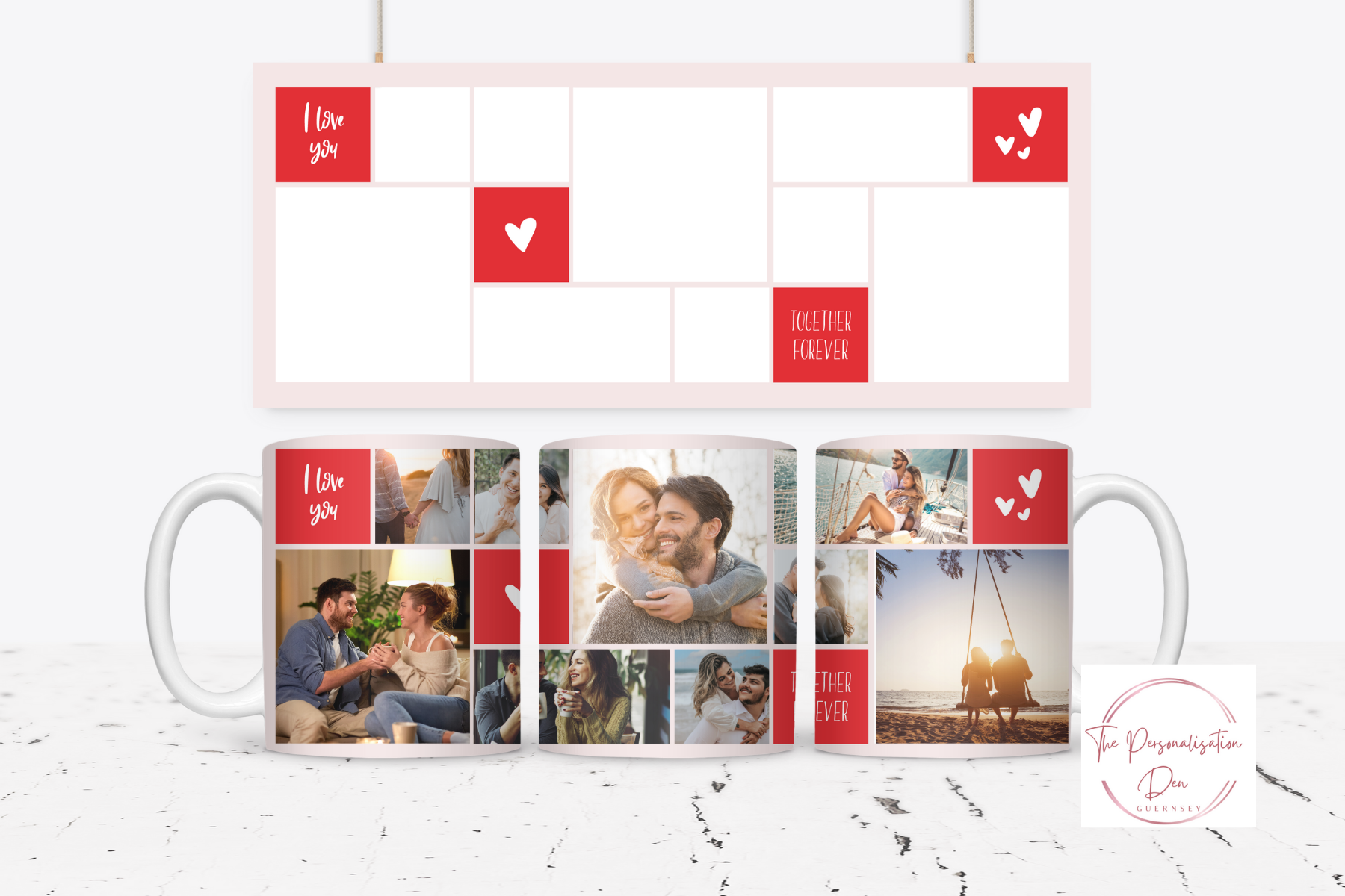 Personalised this I Love You photo mug to create the perfect gift for your loved one. This design is a bright red love design with space to add nine of your favourite photos to. This mug would make an amazing gift for anniversaries, Valentine's day or just to show your love.