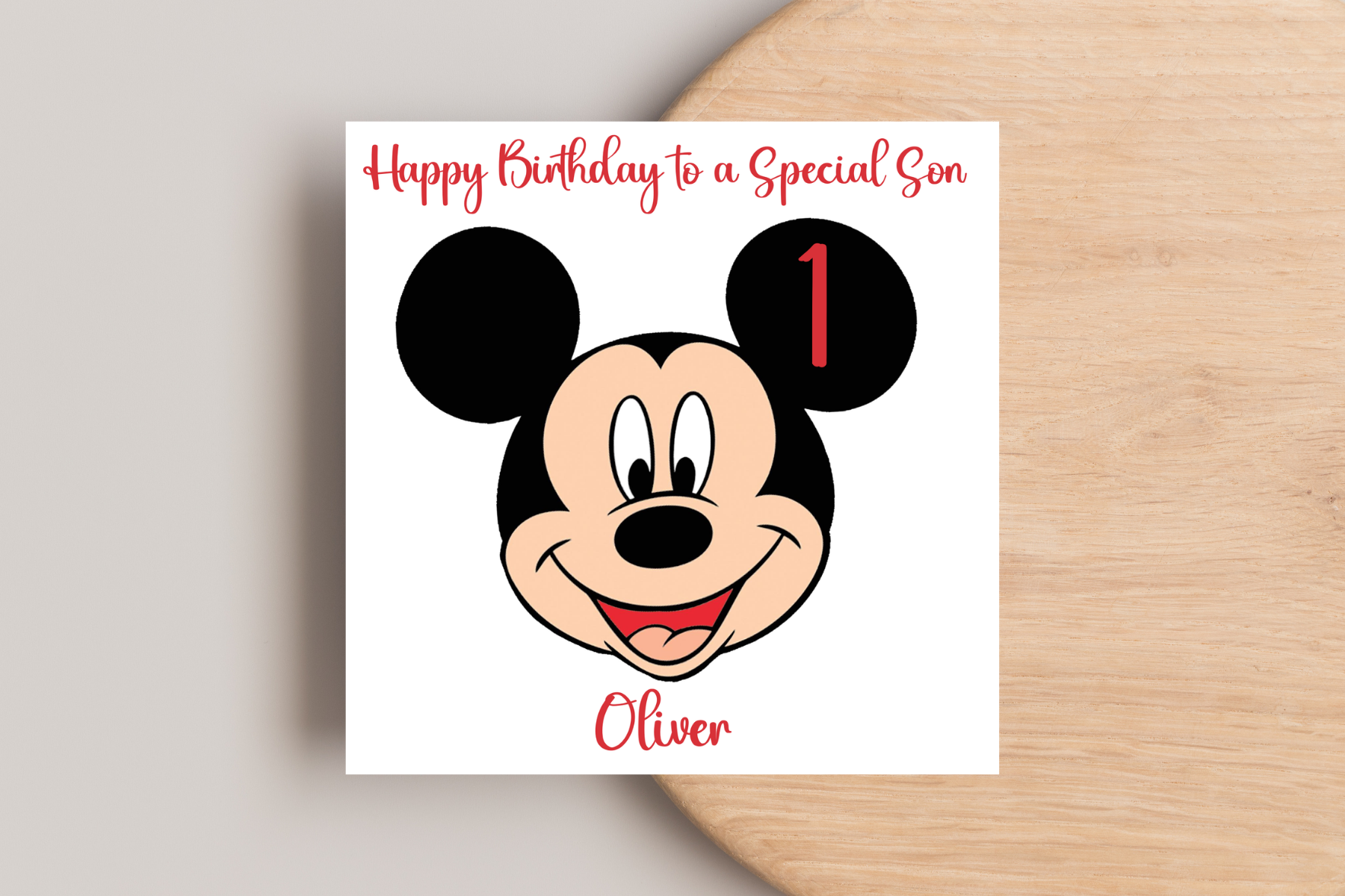 Celebrate your little one's special day with this adorable Mickey Mouse personalised birthday card. Made with high-quality materials, this custom card features the iconic Mickey Mouse design, and can be personalised with your child's name and age. Perfect for 1st birthdays and Disney fans, this card will bring a smile to your son’s, grandson’s or nephew’s face. The vibrant colours and cute design make it a memorable keepsake. Make their birthday extra special with this one-of-a-kind Mickey Mouse birthday card!