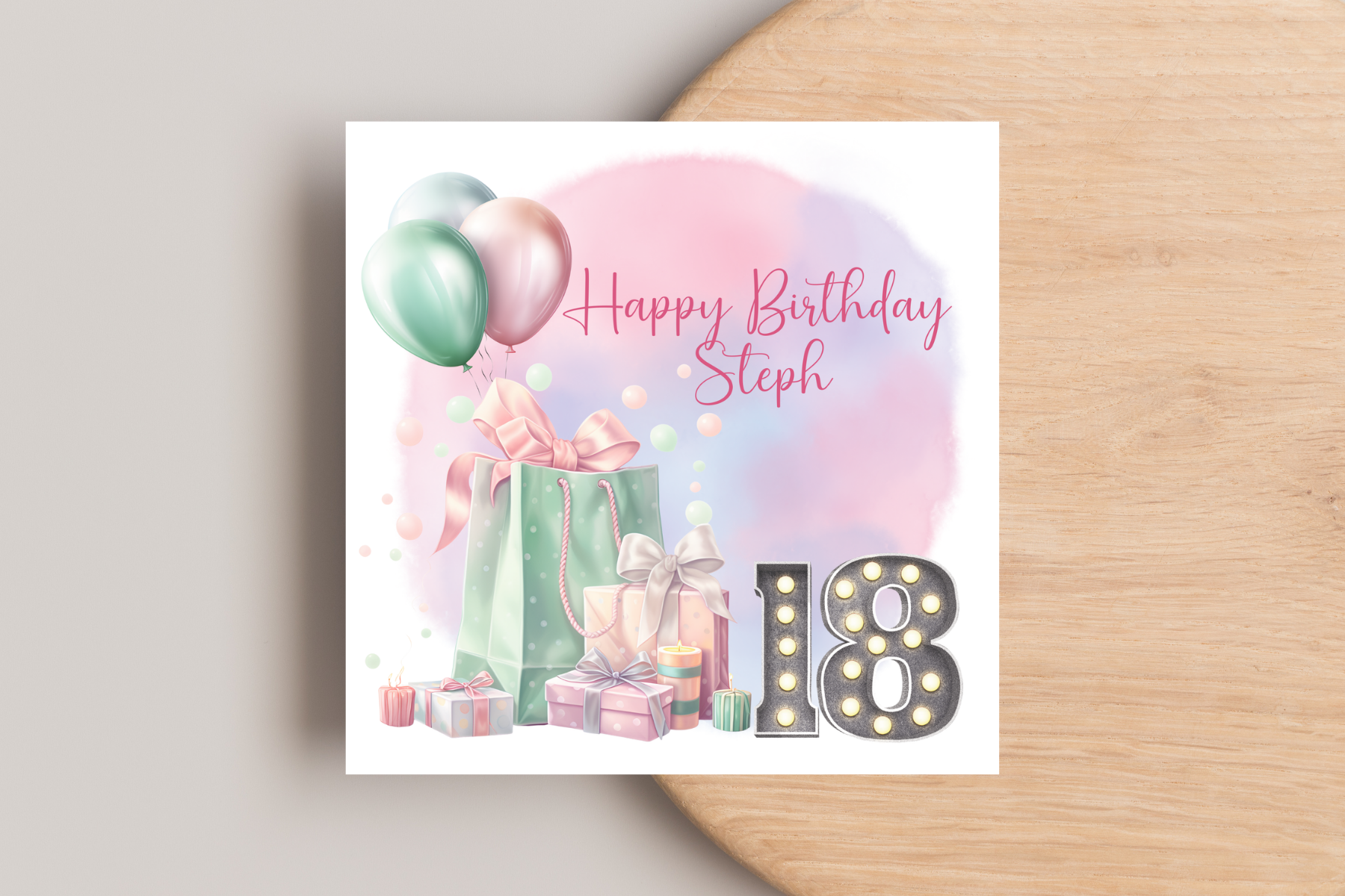 Celebrate your loved ones Special day with our beautiful 18th birthday card. The design features the iconic party light up numbers with balloons attached to various gifts. Personalise it with the recipient's name for that extra special touch.