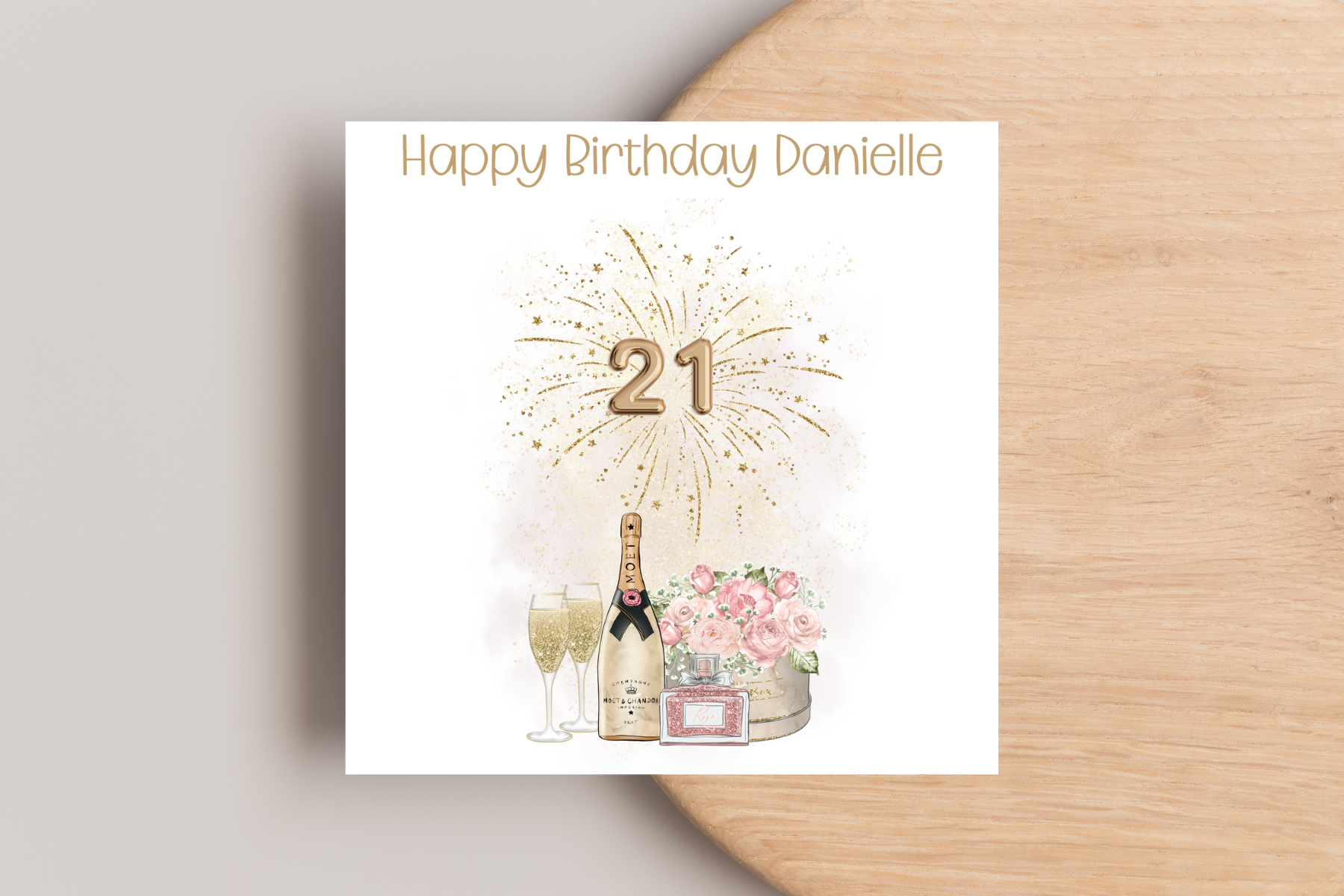 Celebrate her special milestone with our Personalised Birthday Card. This unique card features celebratory items -champagne, flowers and perfume. What makes this card stands out is the '21' lit up in fireworks. Make it truly her own by adding her name. The perfect way to mark this important occasion.
