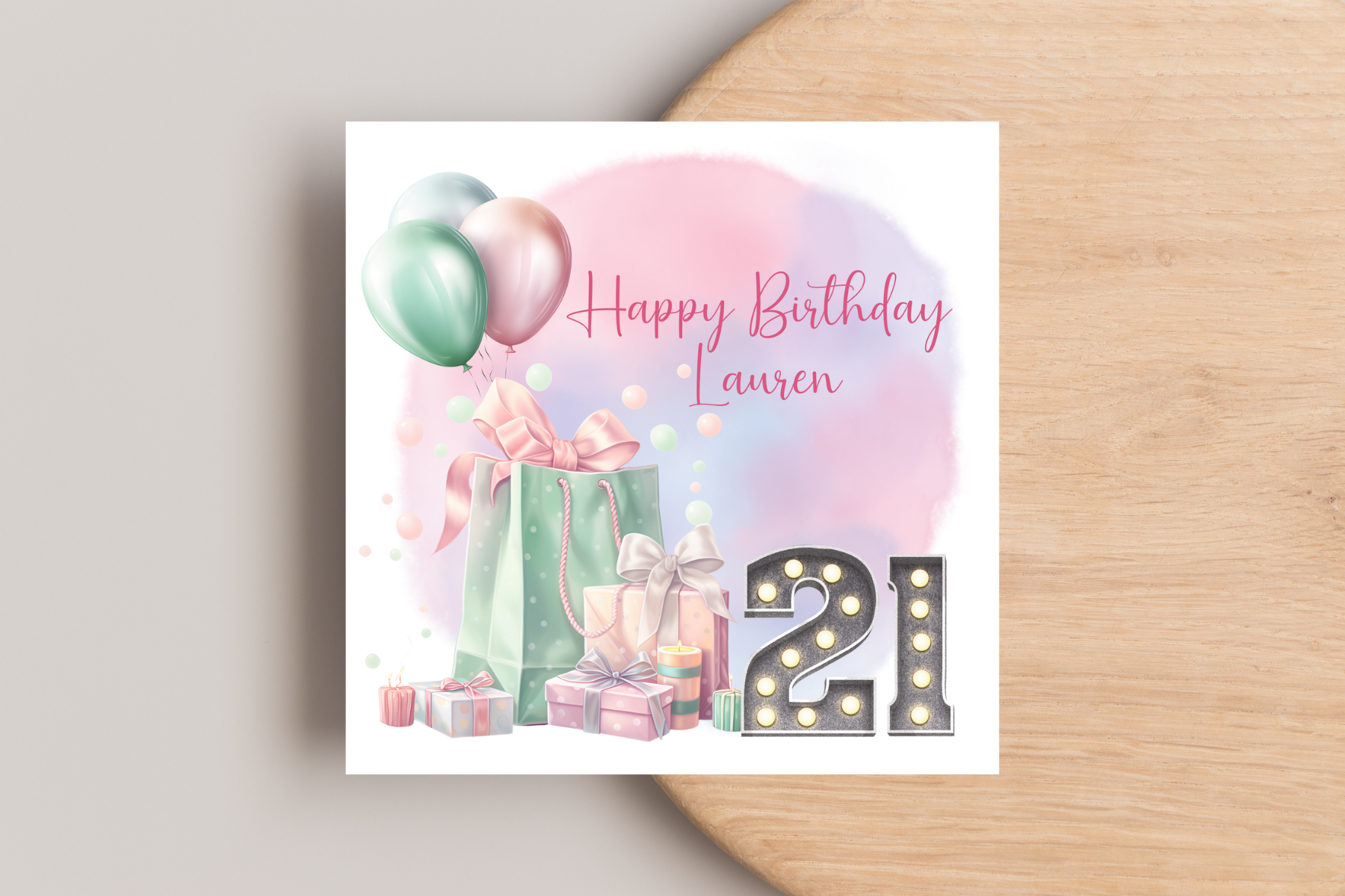 Celebrate your loved ones Special day with our beautiful 21st birthday card. The design features the iconic party light up numbers with balloons attached to various gifts. Personalise it with the recipient's name for that extra special touch.