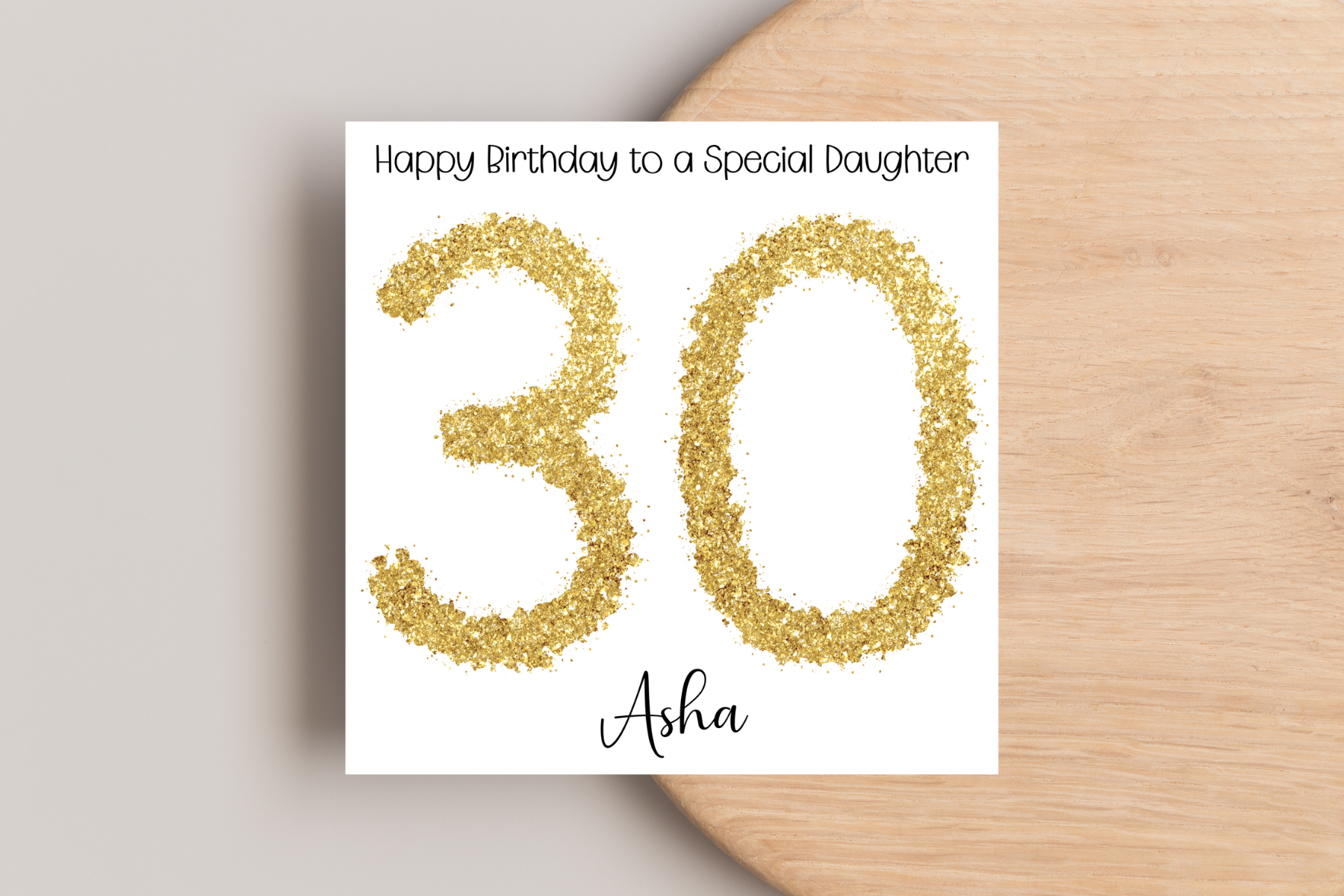 Celebrate your loved ones Special day with our beautiful golden 30th birthday card. Personalise it with the recipient's name and add the relation for that extra special touch.