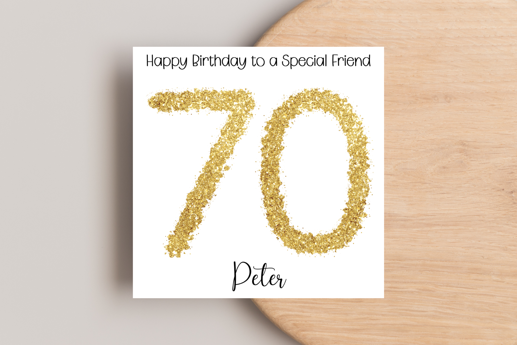 Celebrate your loved ones Special day with our beautiful golden 70th birthday card. Personalise it with the recipient's name and add the relation for that extra special touch.
