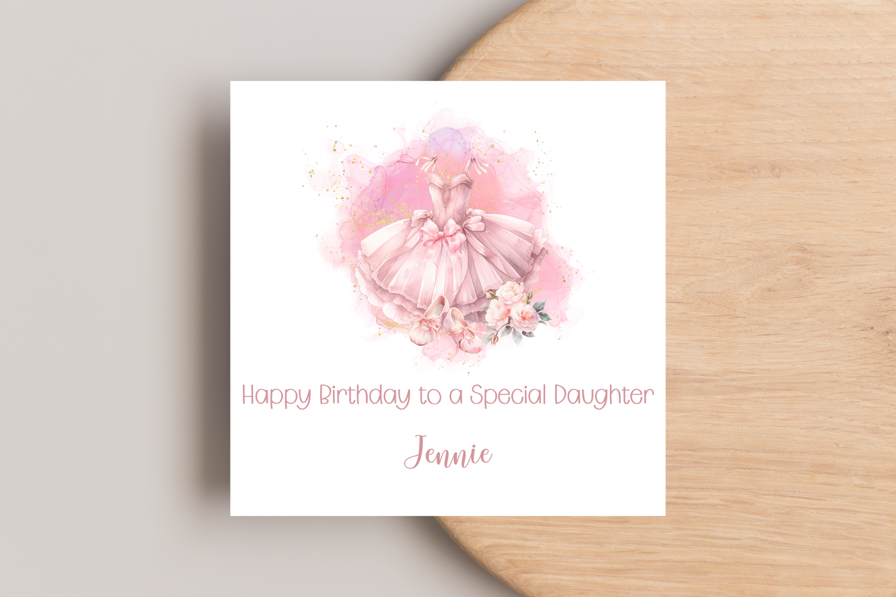A cute pink and girl ballet themed birthday card. 3 different designs available for the special dancers birthday. Add their name and age for an extra special touch.