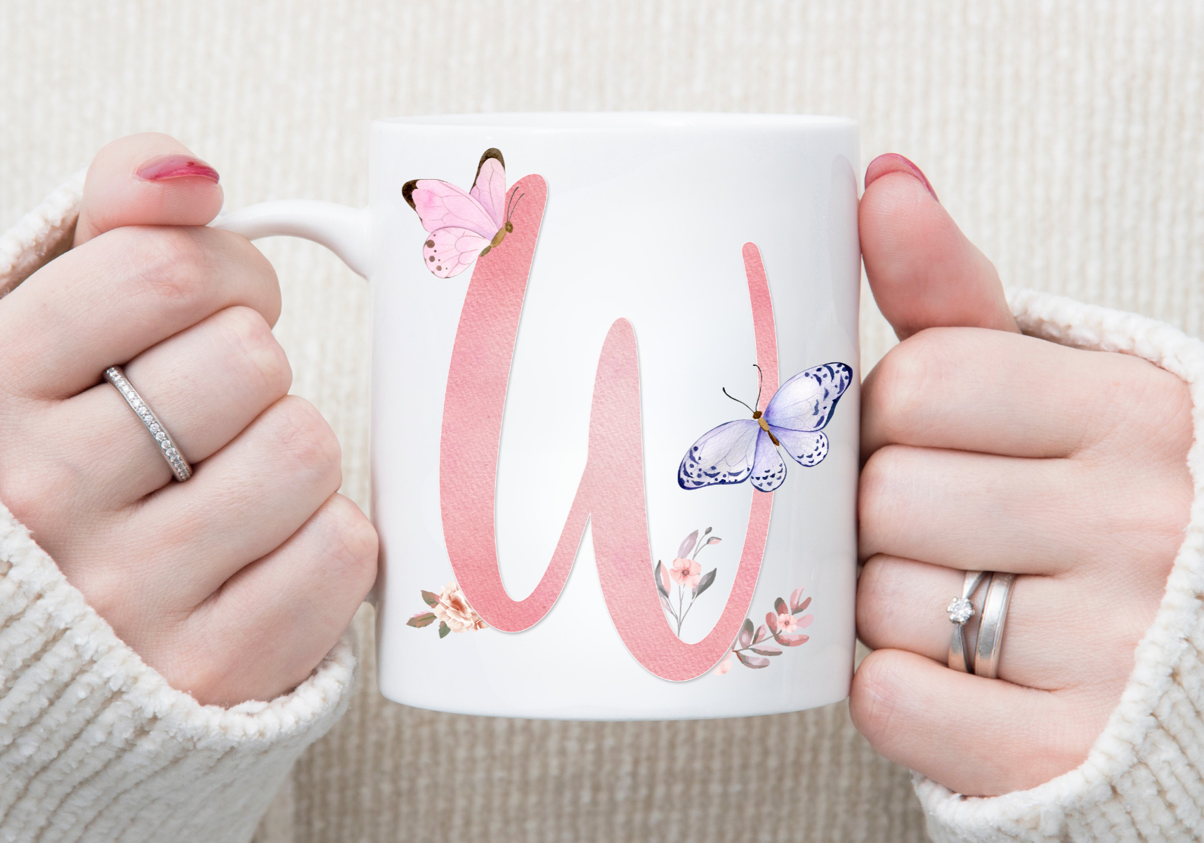 A whimsical mug featuring your chosen initial adorned with delicate butterflies. Each sip becomes a playful moment as these colourful winged friends seem to dance around your personal letter. Perfect for brightening your morning routine or adding a touch of personalised charm to your desk!