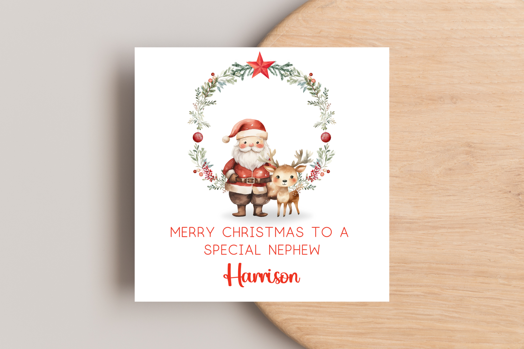 Celebrate the holiday season with our Personalised Christmas card! This card features a charming scene with Santa and one of his reindeer in front of a lovely wreath, you can add personalisation for that extra special touch. Share the joy and warmth of Christmas with your loved ones. Order now!
