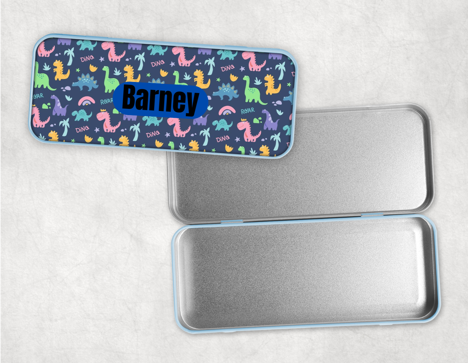 Keep your pencils safe and stylish with our Personalised Dinosaur Pencil Tin! Featuring a bright colourful dinosaur design,  this tin can be customised with your name or initials. Perfect for school or office supplies.
