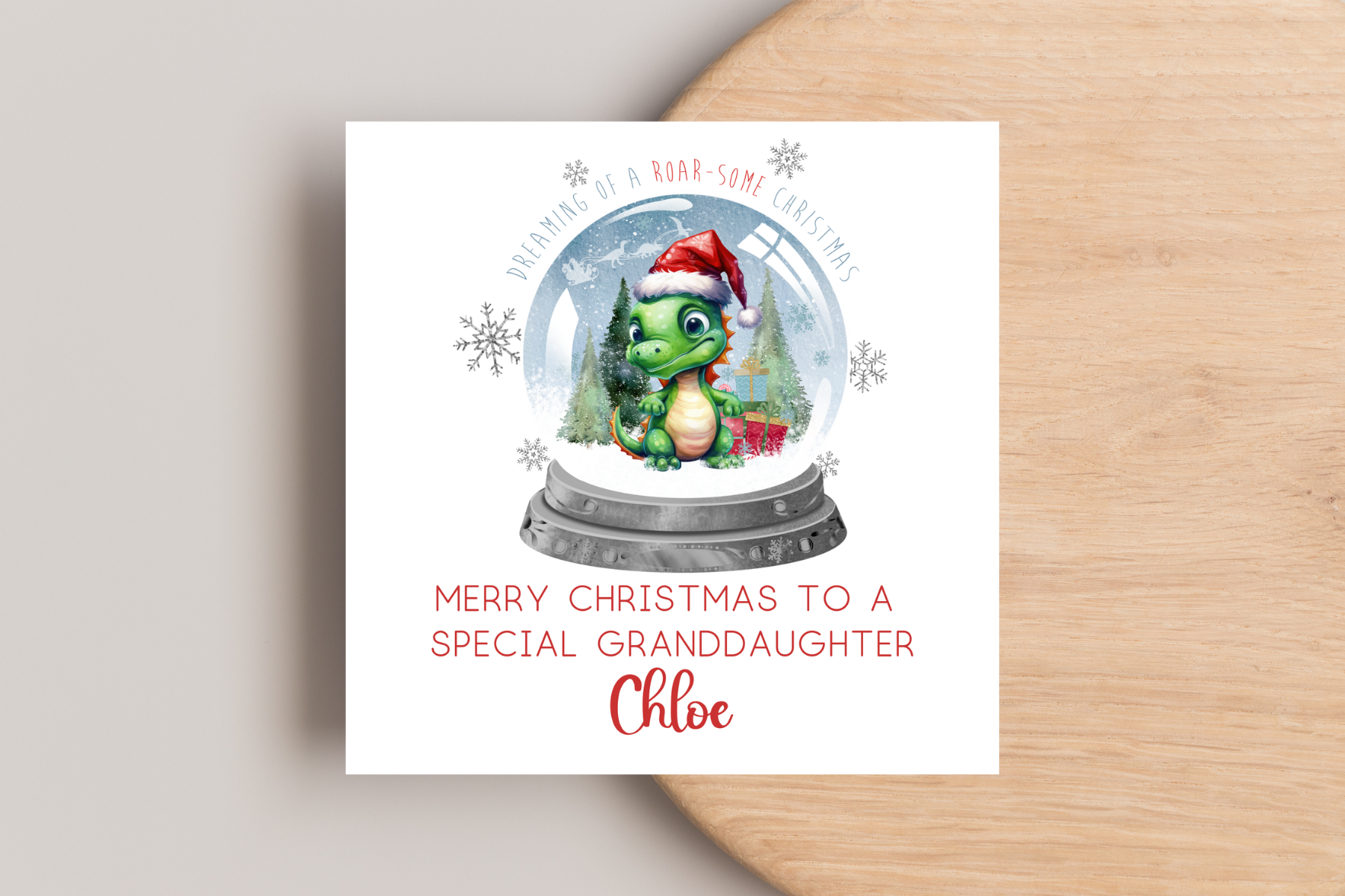 Celebrate the holidays with a unique touch! Our Personalised Dinosaur Christmas Card features a dinosaur in a snowglobe. Customize the card with a name, making it a special and one-of-a-kind gift. Perfect for any dino-lover in your life!