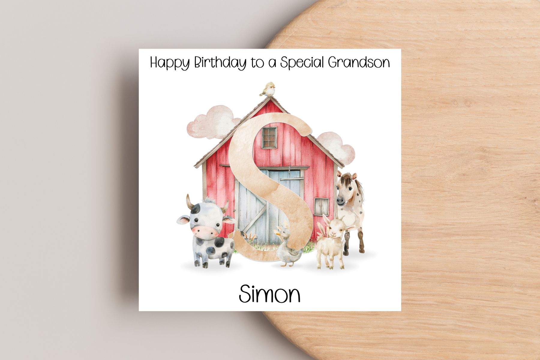 Get ready to celebrate with a personalised farm barn birthday card! Featuring a charming red barn and adorable animals, this card is customizable with a golden initial to really make it special. Perfect for any animal lover's birthday.