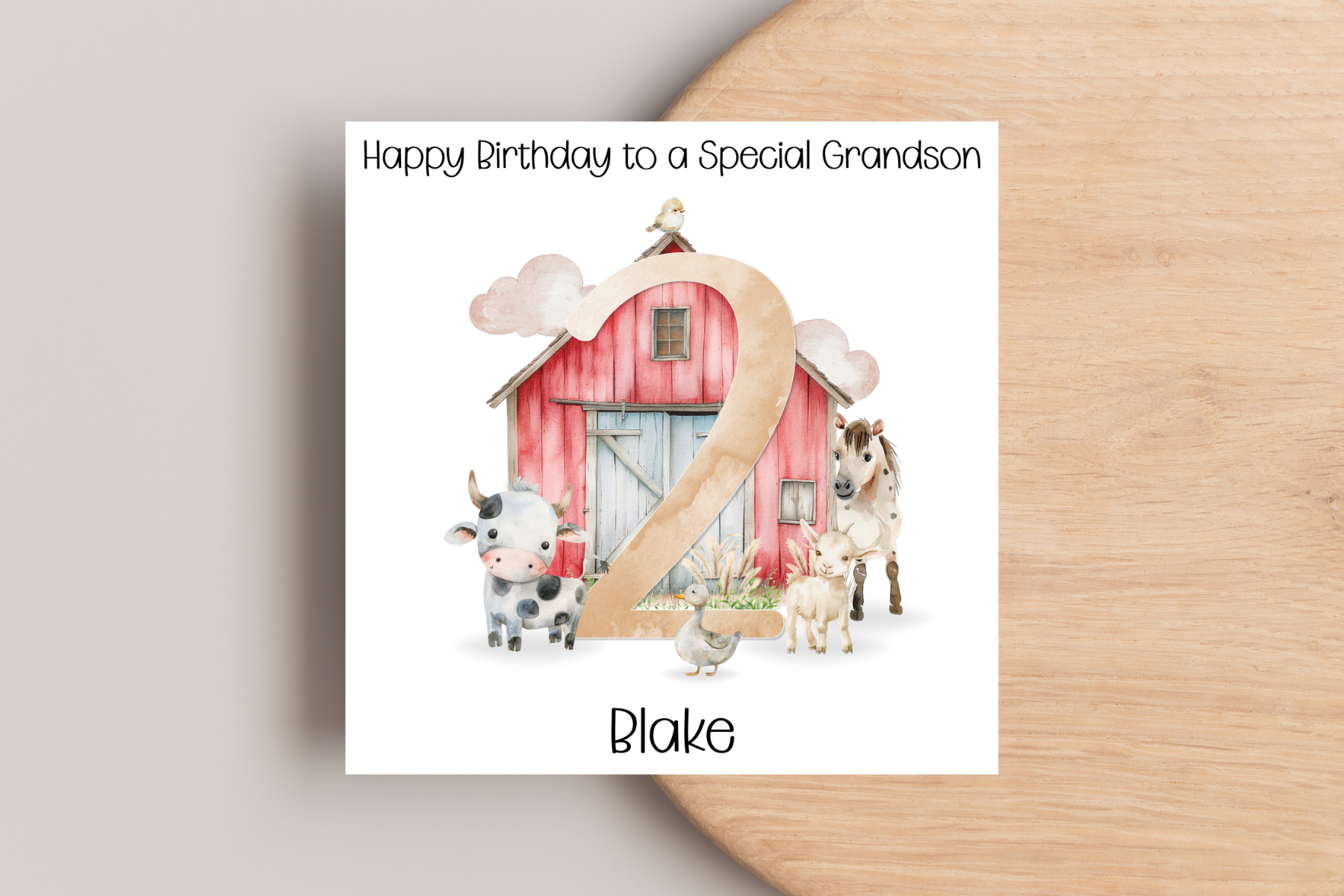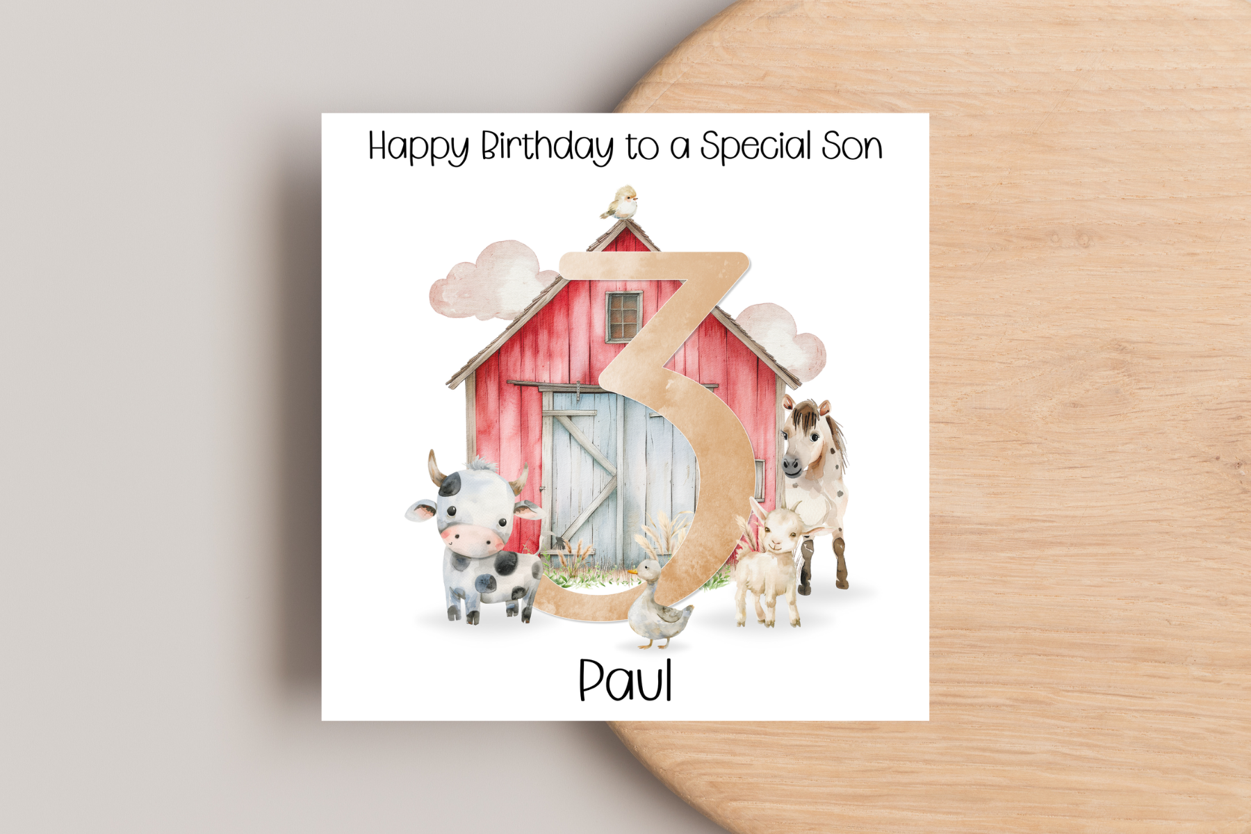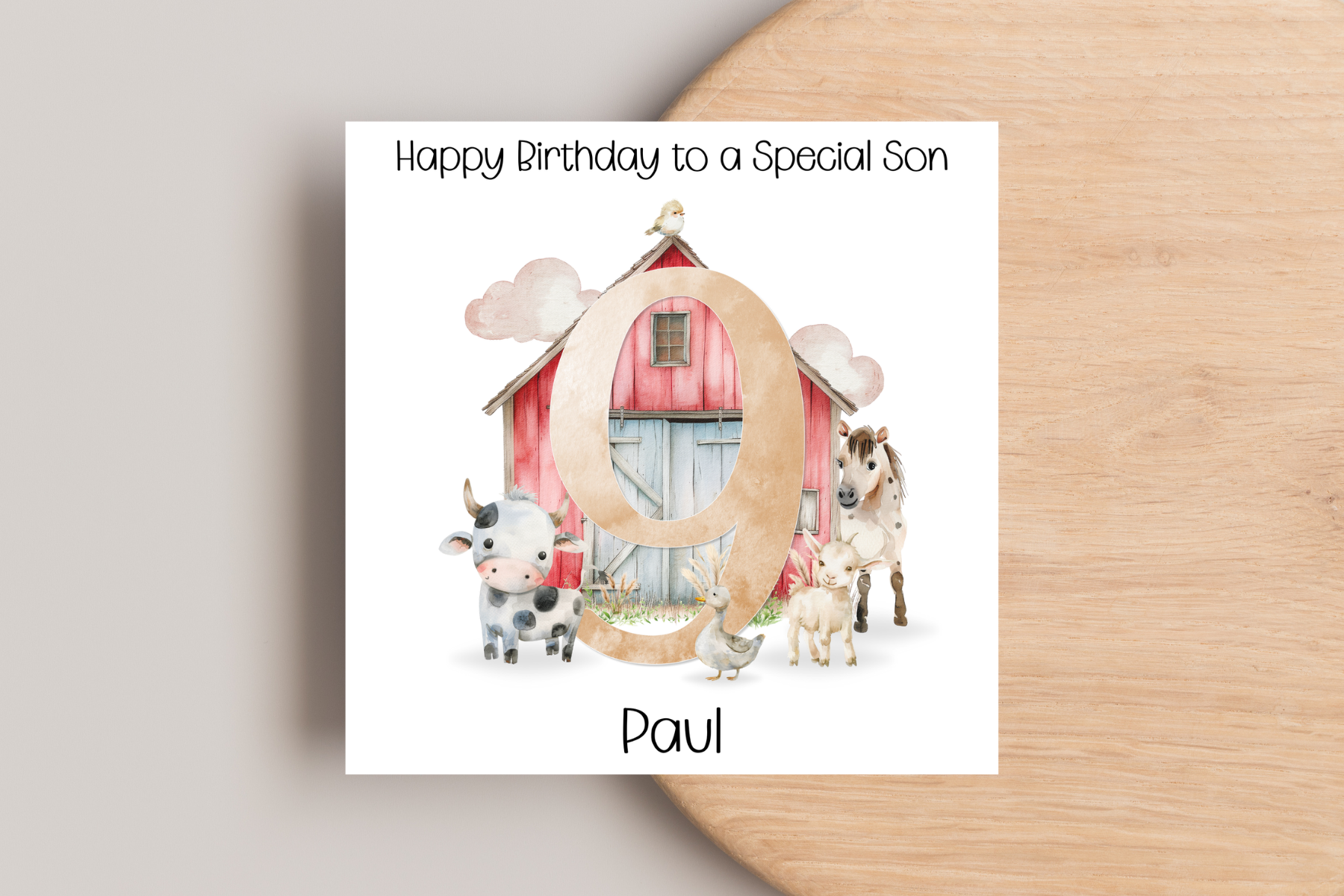 Get ready to celebrate with a personalised farm barn birthday card! Featuring a charming red barn and adorable animals, this card is customisable with a golden number to really make it special. Perfect for any animal lover's birthday.