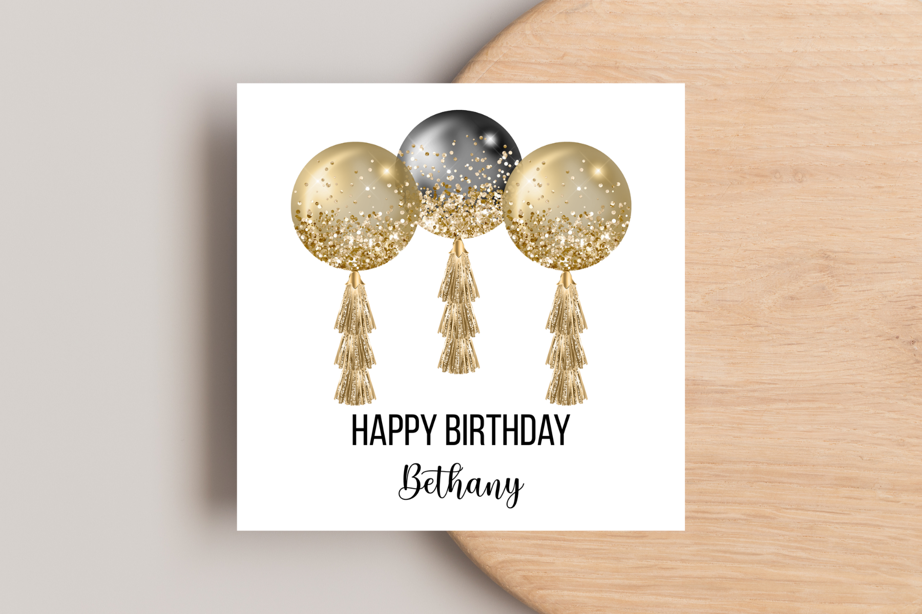 Surprise them with a Personalised Black and Gold Balloons Birthday Card! Featuring coloured balloons in black and gold, accented with gold glitter and matching tassels. Show them you care with this thoughtful and unique card made just for them.