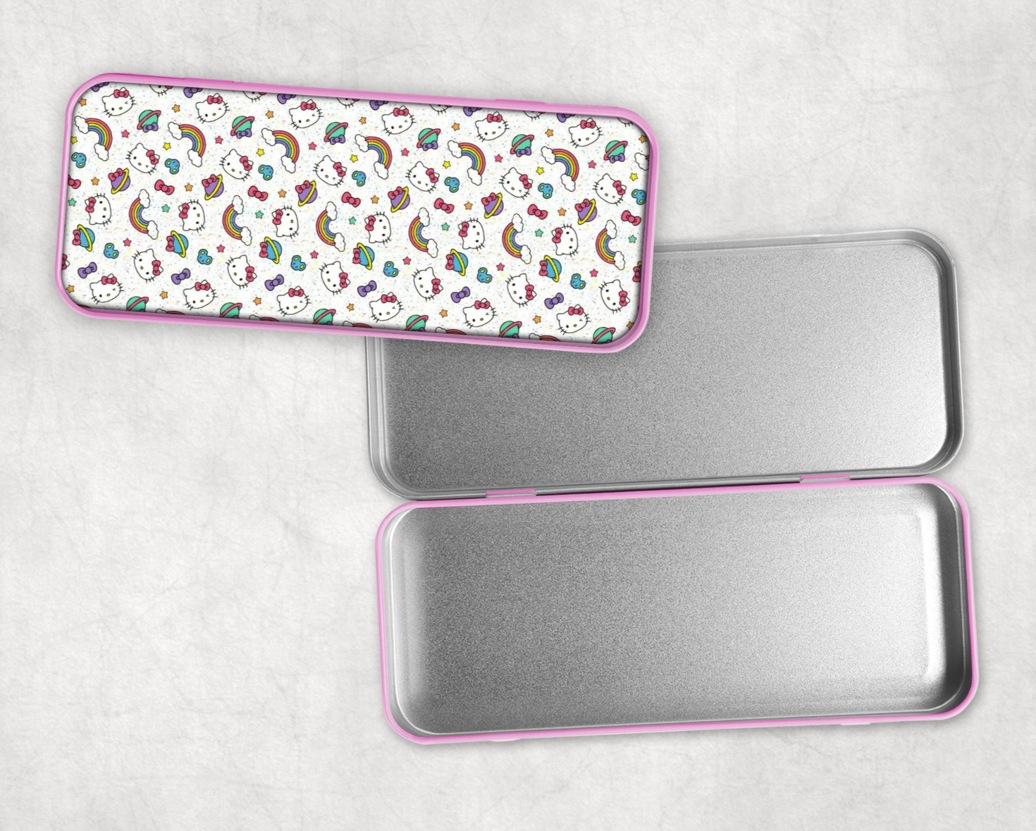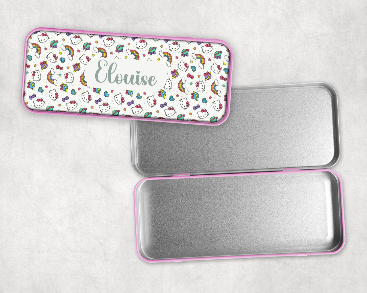 Keep your pencils safe and stylish with our Personalised Hello Kitty Pencil Tin! Featuring a beautiful design, this tin can be customised with your name or initials. Perfect for school or office supplies.