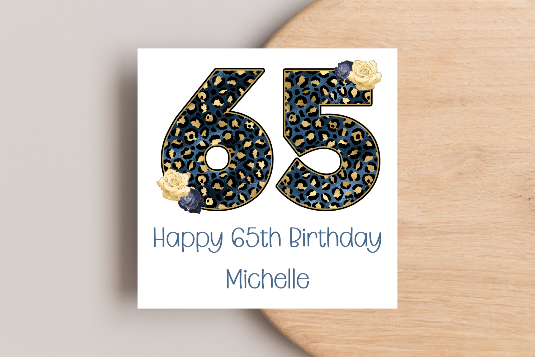 Celebrate your loved ones Special day with our beautiful navy blue and gold leopard print 65th birthday card. Personalise it with the recipient's name for that extra special touch.