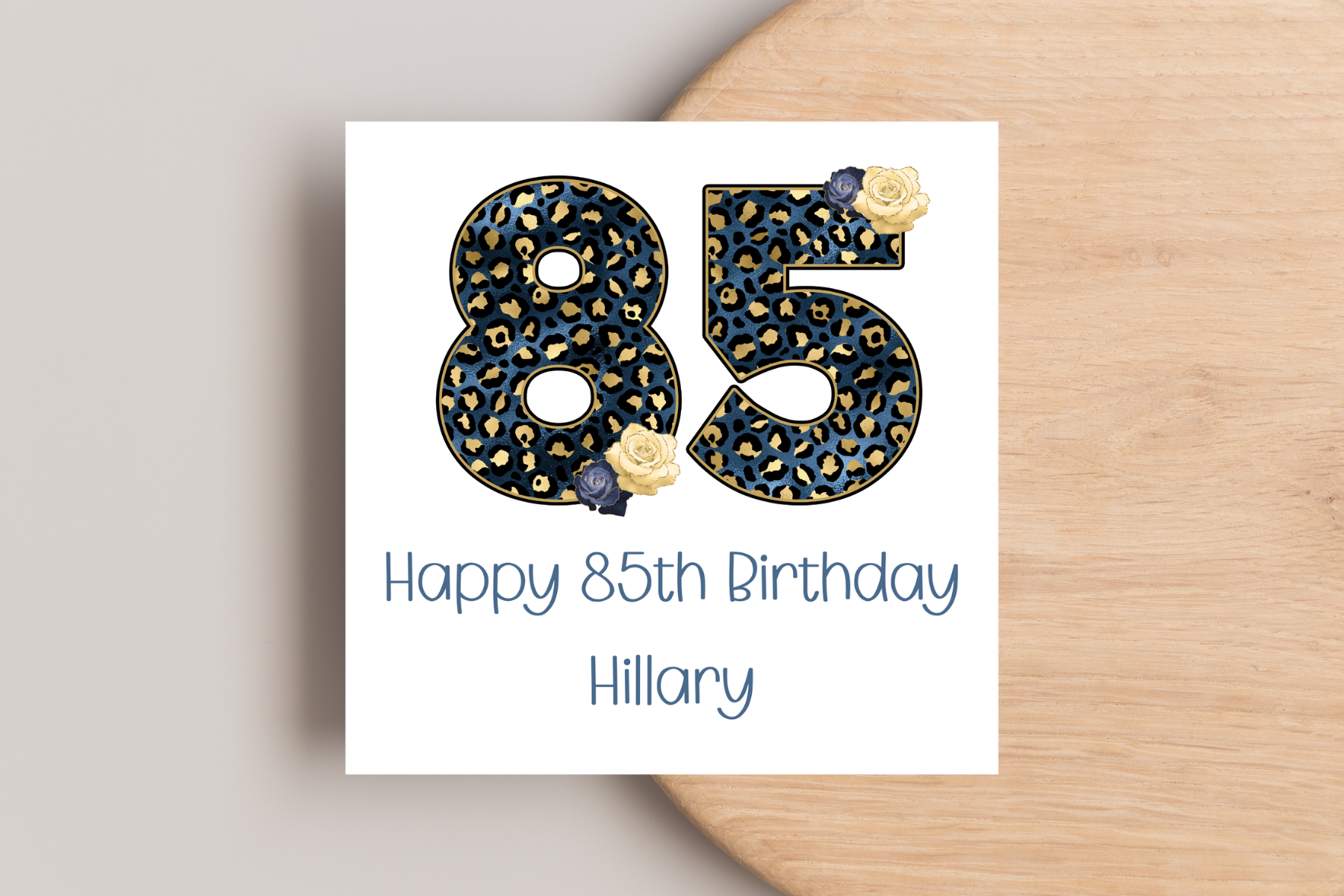 Celebrate your loved ones Special day with our beautiful navy blue and gold leopard print 85th birthday card. Personalise it with the recipient's name for that extra special touch.