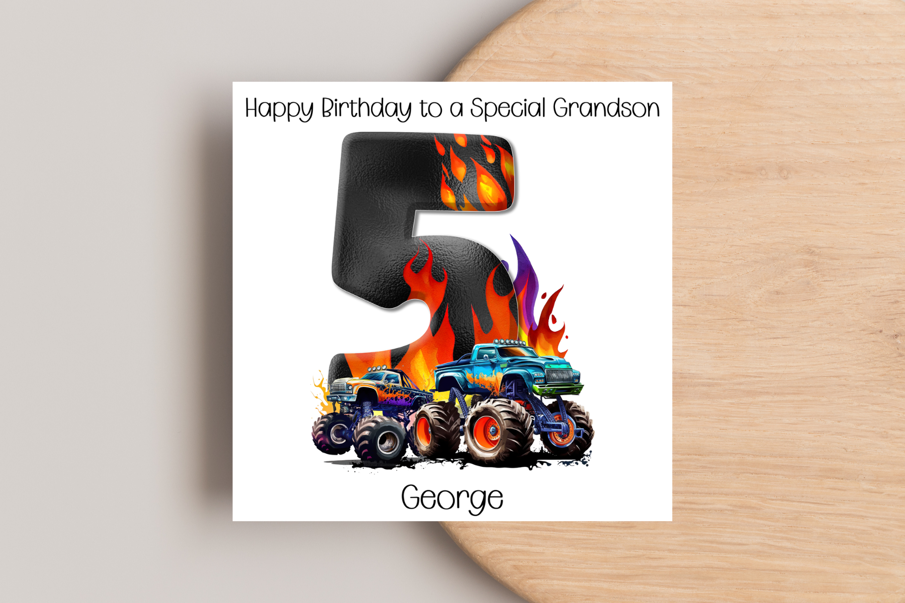 Celebrate a monster of a birthday with our Personalised Monster Truck Birthday Card! Watch their age go up in flames (don't worry, it's just a design) with monster trucks in front. Available for ages 1-13, this card will rev up the birthday fun. Don't forget to personalise it for that extra special touch.