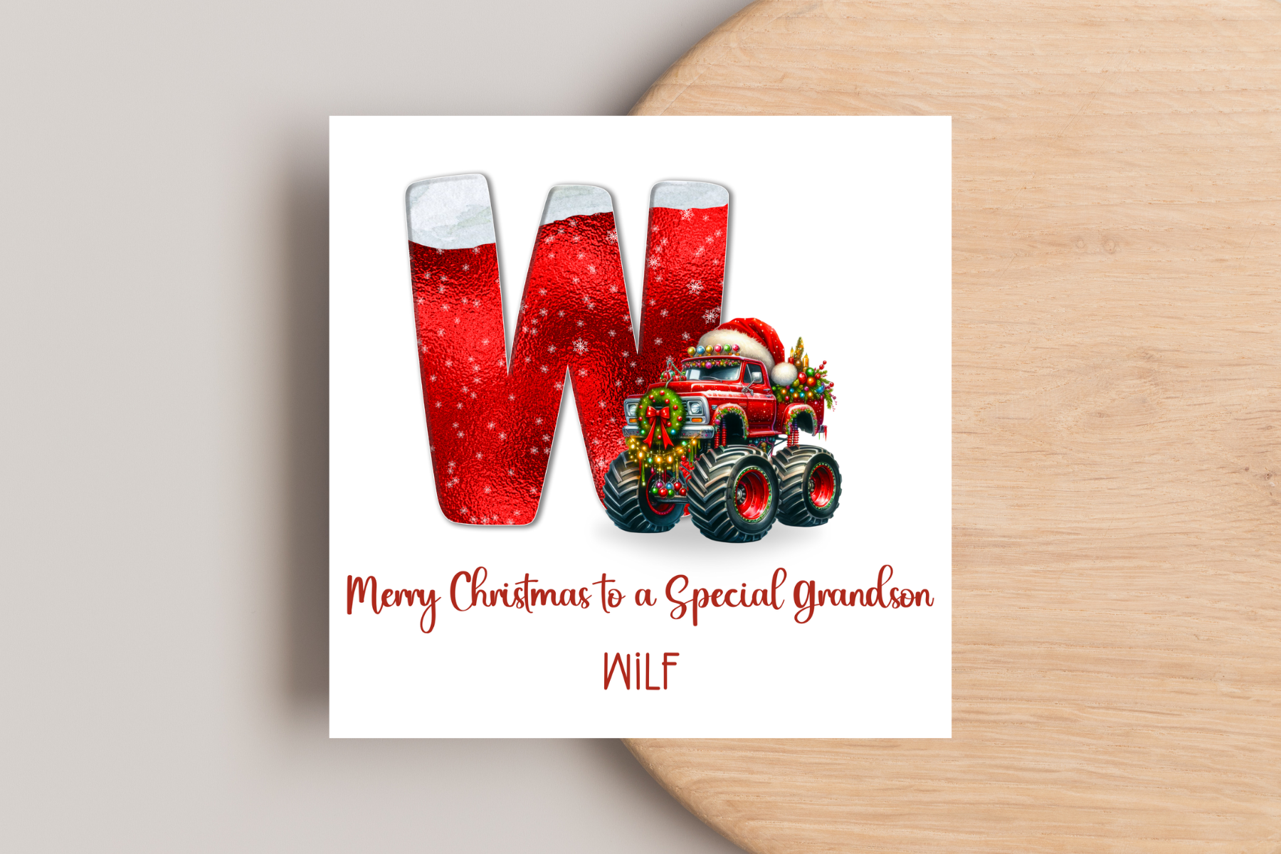 Bring holiday cheer with this Personalised Monster Truck Christmas Card, featuring a snowy effect and a bold red initial. Perfect for fans of monster trucks, it adds a unique and festive touch to your season’s greetings. Customise it easily to make your Christmas wishes stand out with a personal flair that shows you care.