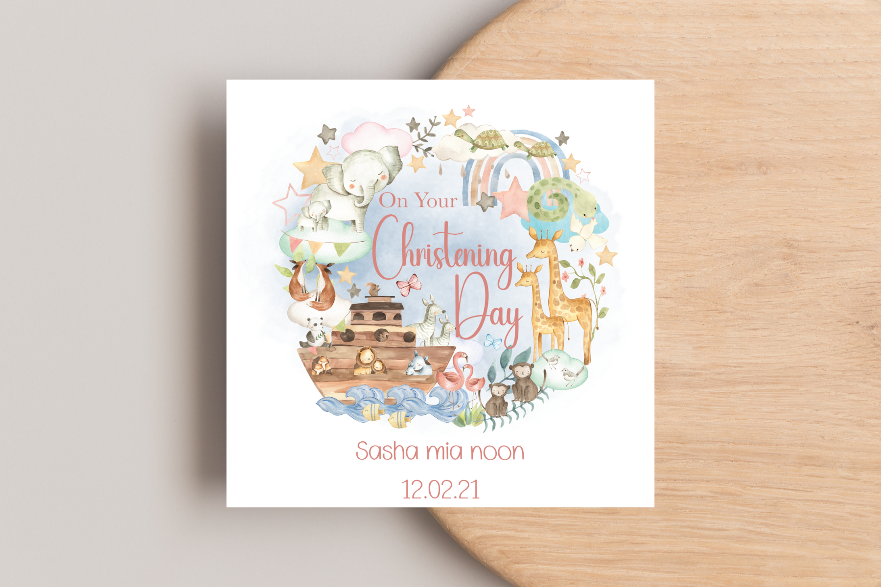 Beautiful Noah's Ark themed Christening Card. This card can be Personalised with a name and date of Christening.