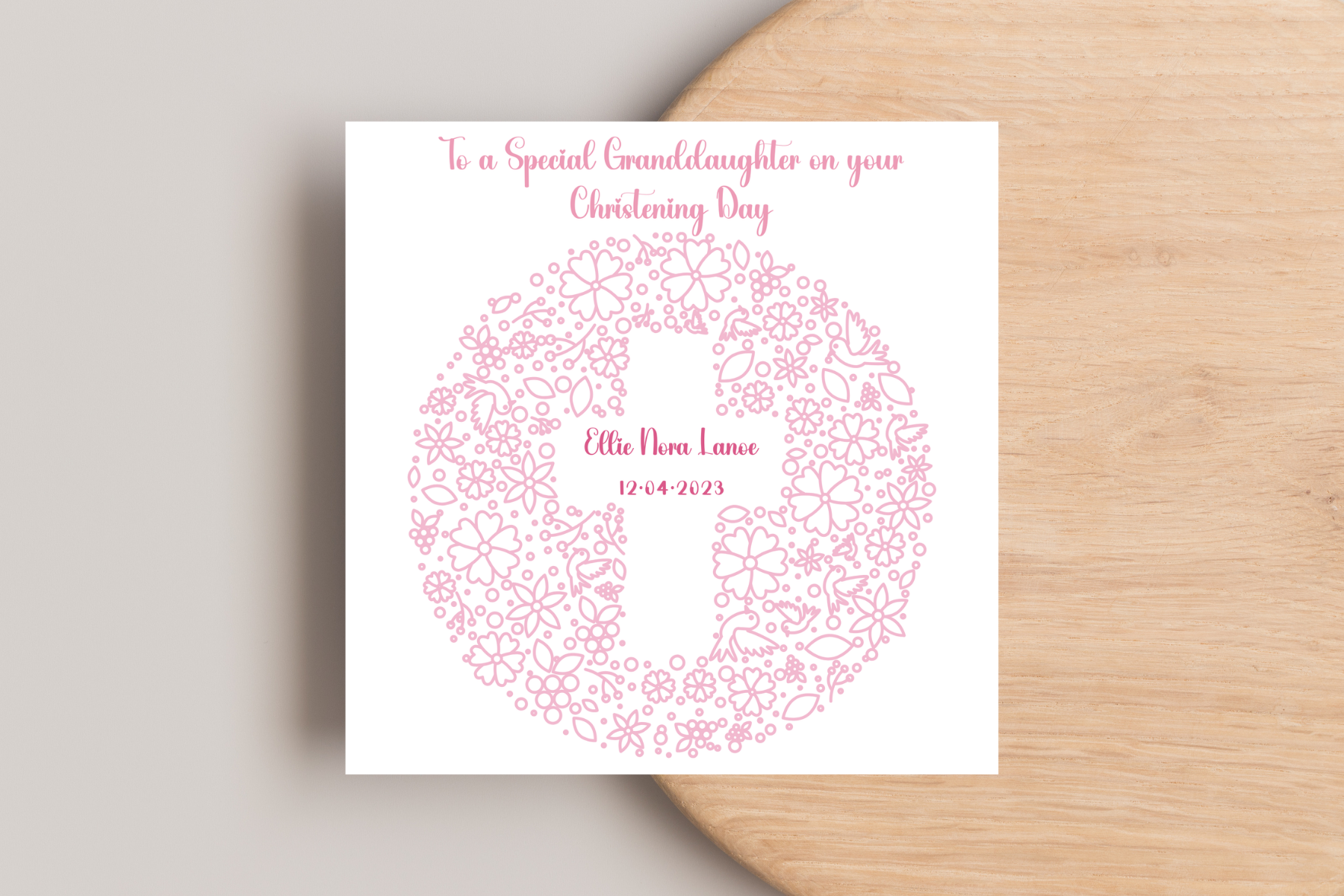 Beautiful pink cross Christening Card. This card can be Personalised with a name, relationship and date of Christening.
