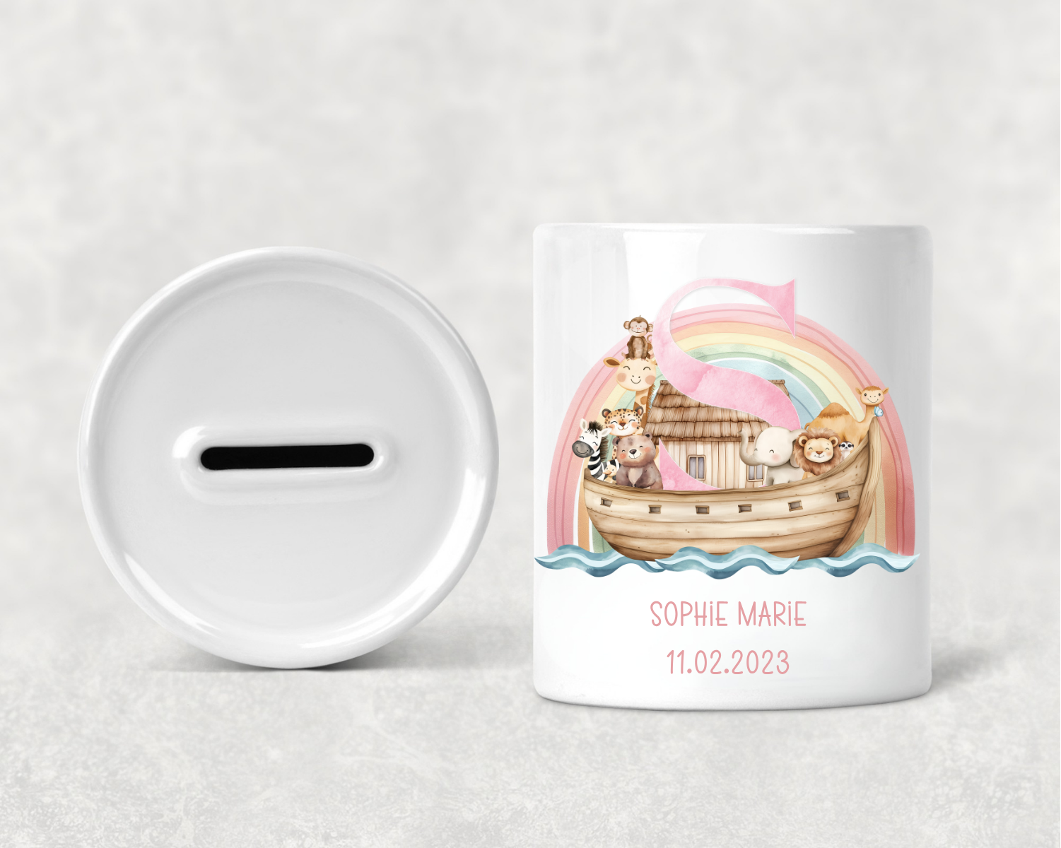 Make saving fun with this Personalised Pink Noah's Ark Money Box! Featuring charming animal designs and a bright blue finish, it’s perfect for encouraging little ones to stash their coins. Personalise it with a name to create a special keepsake that grows with your child’s savings. A playful and practical gift that adds joy to every penny saved.