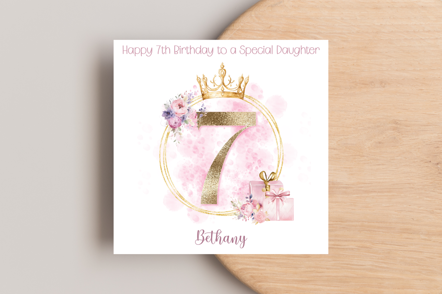 Celebrate your little princess's 7th birthday with our personalised Princess Inspired Birthday Card! Featuring a stunning pink and gold design, this card is sure to make her feel like royalty. Make it extra special by personalising it just for her. A perfect way to show your love and make her birthday even more magical.