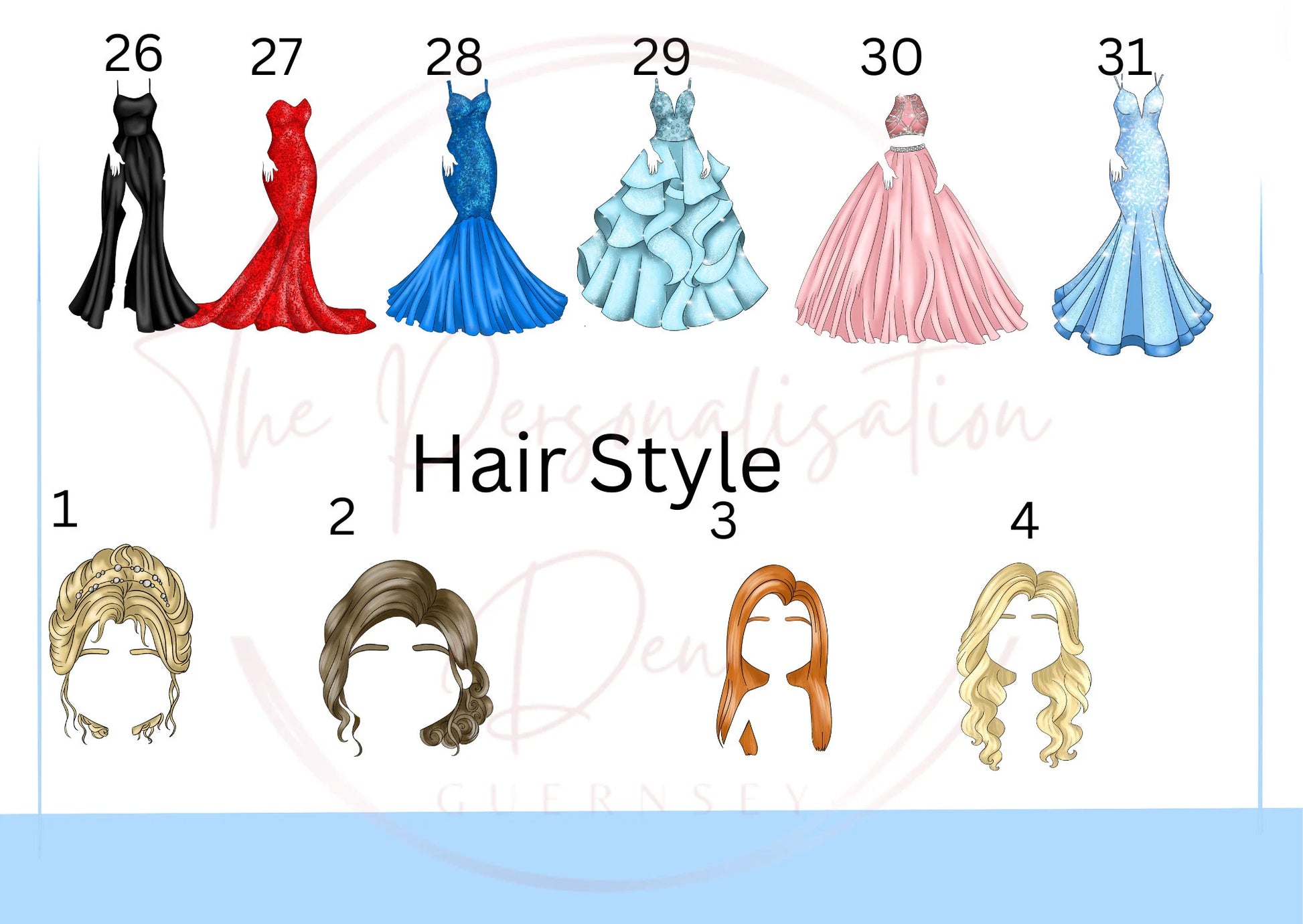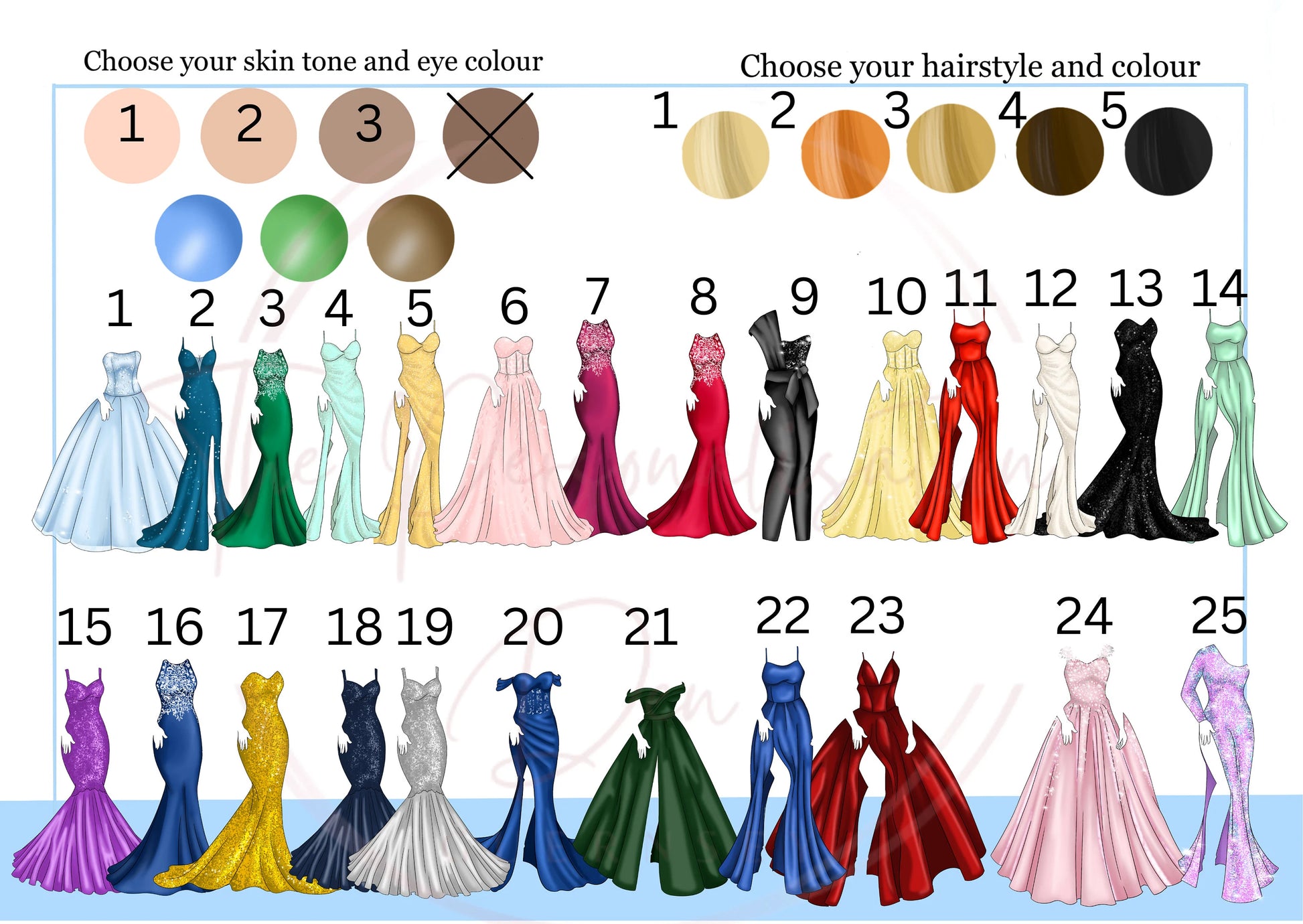 The Doll is customisable meaning you have plenty of options to choose from to create your look-a-like. We have 4 skin tones, 3 eye colours plus various hair colour and styles. Once you have them chosen, we have 31 outfit options for you.
