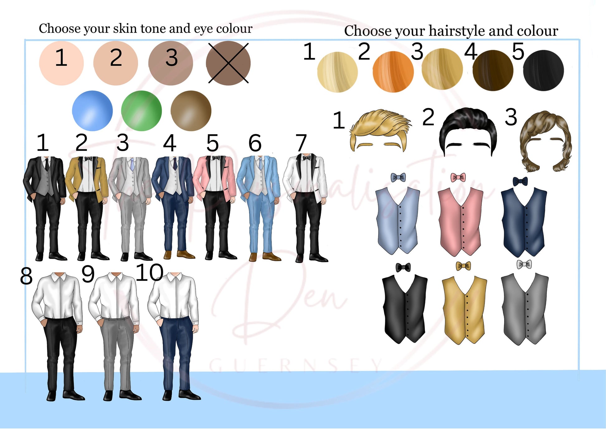 Outfit styles 8, 9 and 10 is a white shirt with either black, grey or navy trousers. These can be matched up with a waistcoat and dickie bow if you wish, please leave this information with the name.
