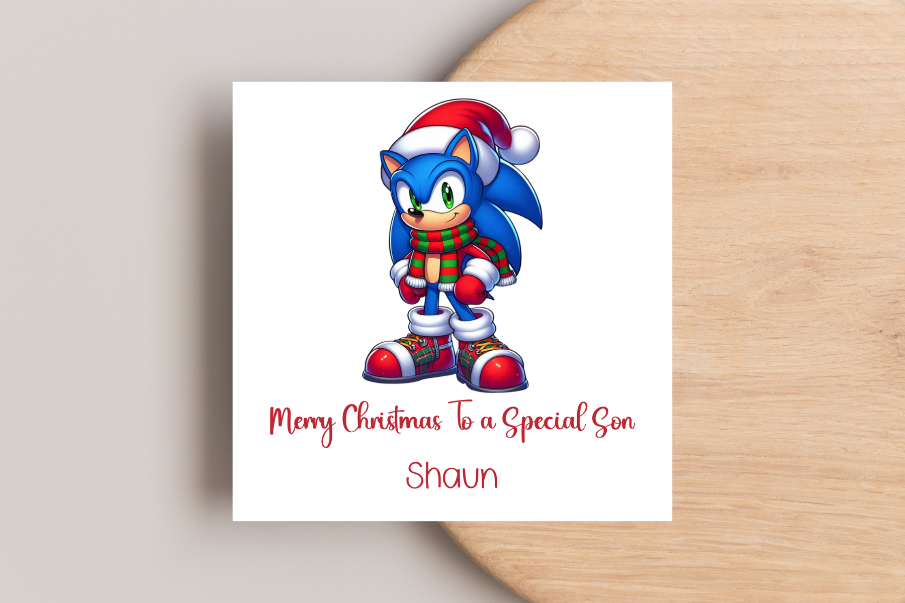 Wish your loved ones a speedy blue Christmas with our personalised Sonic Christmas card! Featuring everyone's favourite hedgehog sporting a festive hat, this card will bring a smile to any gamer's face. Customize the card with a special message for an extra touch of holiday cheer.