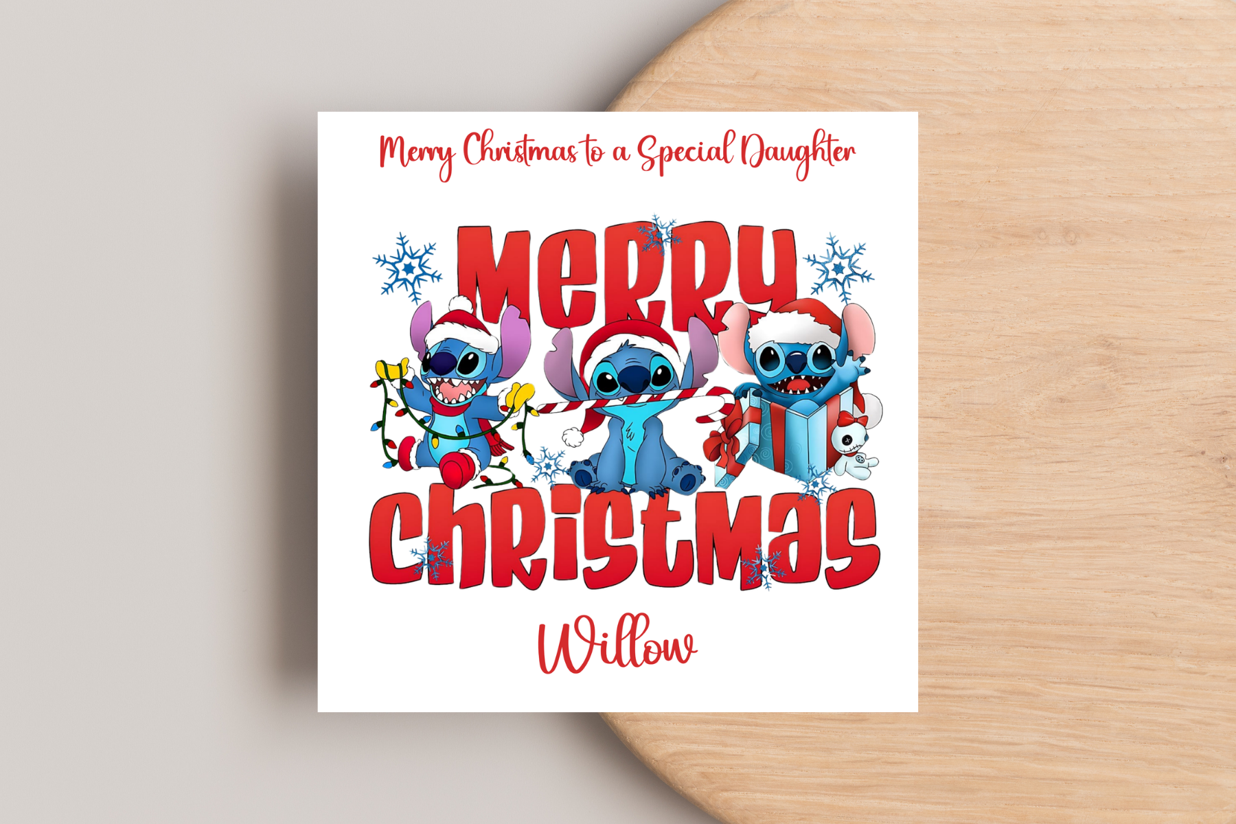 Introducing our adorable personalised Stitch Christmas card! This charming handcrafted card features everyone's favourite Character - Stitch, spreading holiday cheer. Each card is carefully made to order, allowing you to add a touch of personalisation for that special someone. With its vibrant colours and festive design, this card is sure to make the perfect addition to any Christmas celebration. Dimensions: 6x6inches. Spread the holiday magic with our personalised Card and buy yours today.