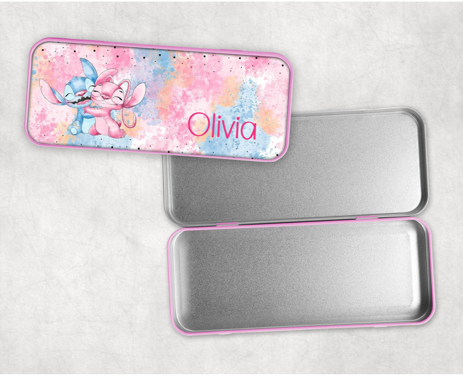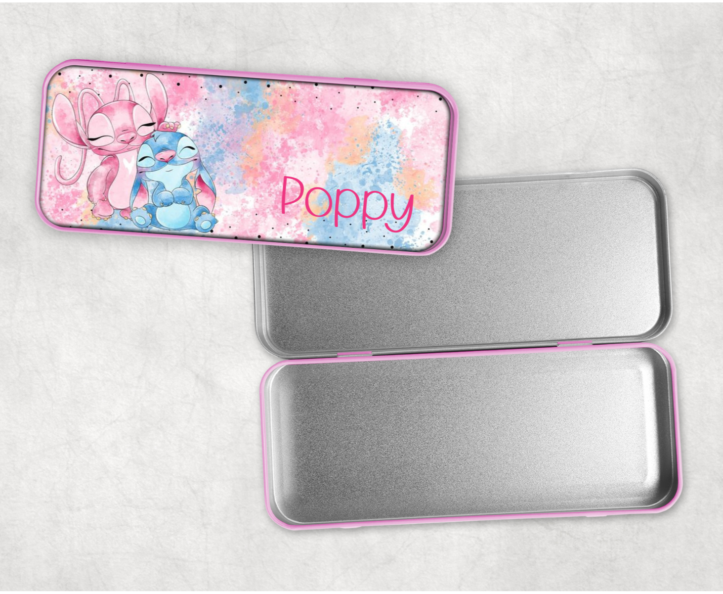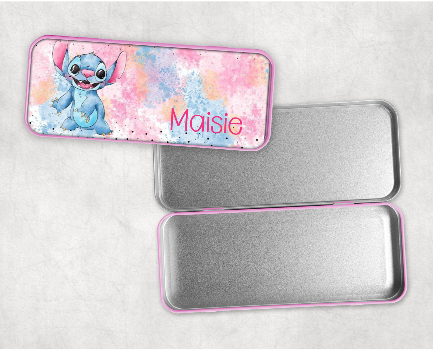 Keep your pencils safe and stylish with our Personalised Stitch Pencil Tin! Featuring everyone's favourite alien, Stitch, this tin can be customised with your name or initials. Perfect for school or office supplies.