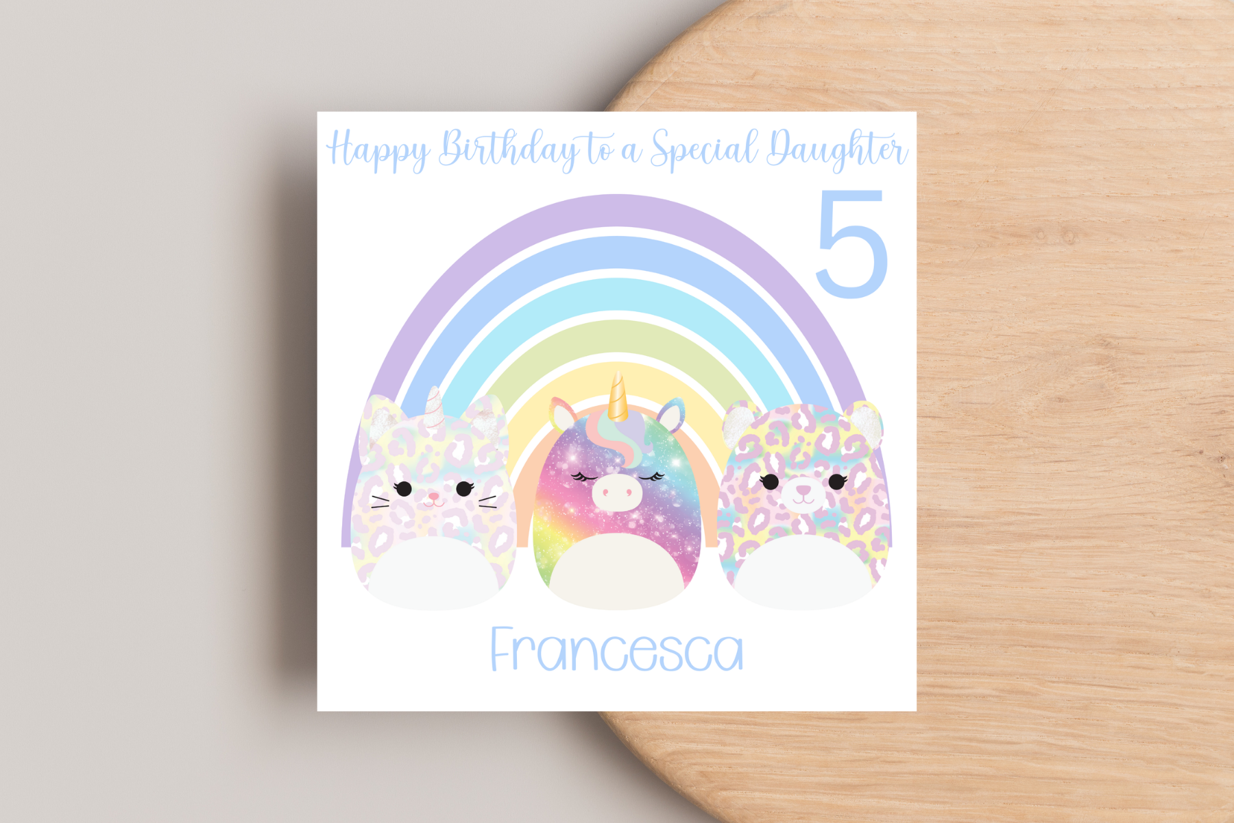 Celebrate your loved ones special day with our Squishmallow birthday card! This adorable personalized card features a pastel rainbow with squishmallows in front. We can customize it with the recipient's name, age, and relation to make it truly one-of-a-kind. Perfect for young fans, this card will bring smiles and joy to any birthday celebration.