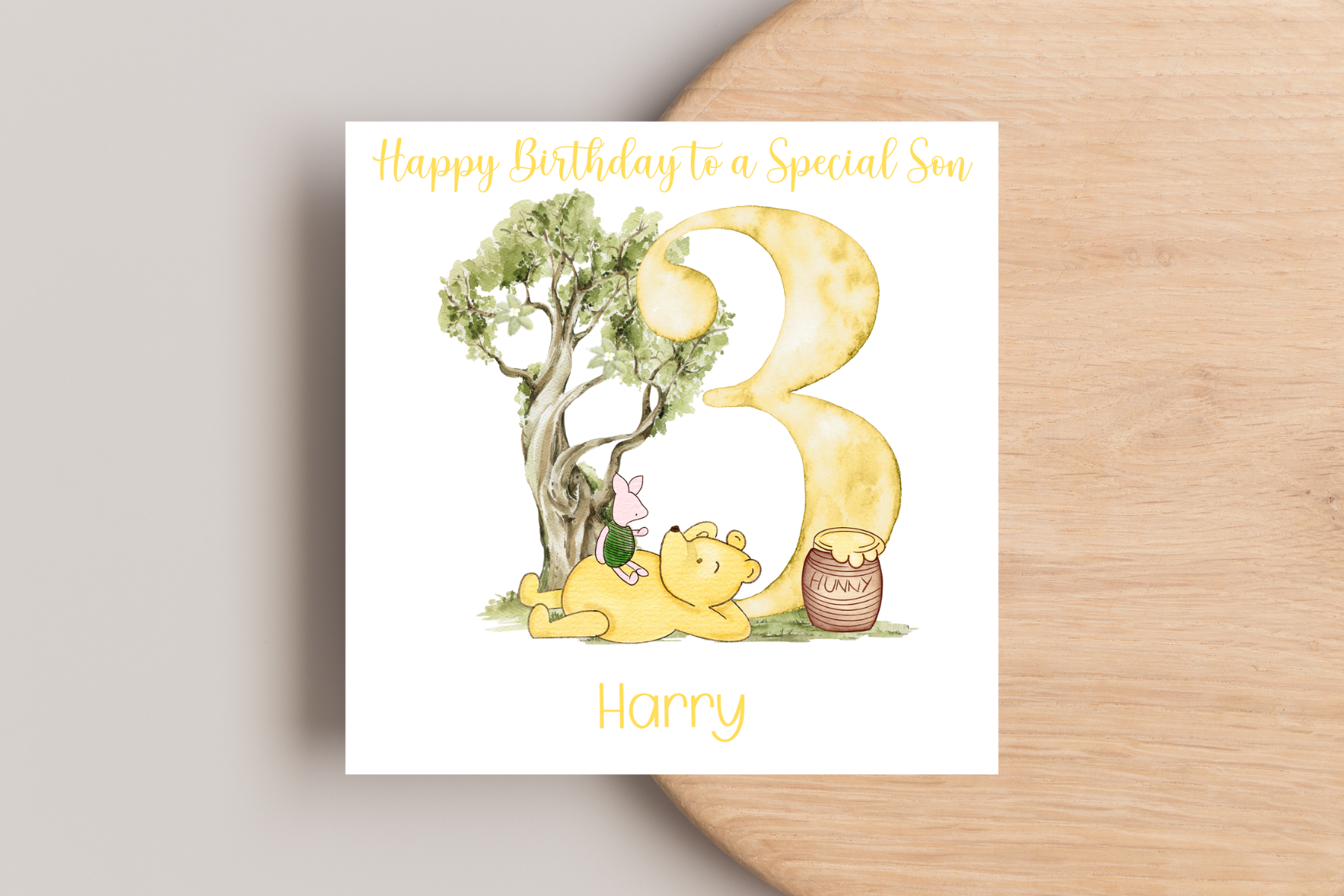 Celebrate your little one's birthday with this adorable personalised Winnie the Pooh 3rd Birthday card. This charming card features a cute design of Winnie relaxing under a tree with, making it a perfect choice for parents of Winnie fans, and anyone looking for a delightful birthday card. The card can be customised with any name adding a special touch to their celebration. Each card is carefully crafted with high-quality materials, ensuring a beautiful and lasting keepsake.