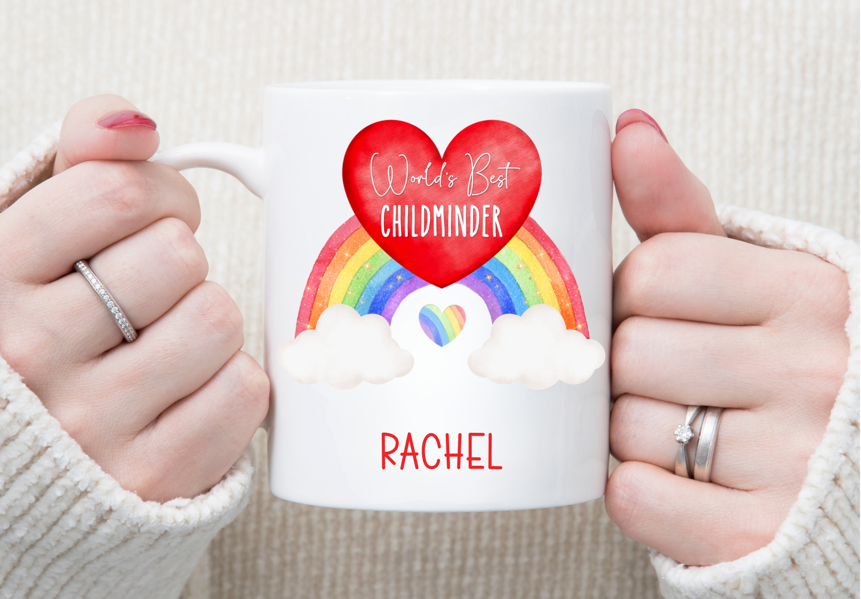 Show your favourite Childminder some well-deserved appreciation with our Personalised Worlds Best Childminder Mug! This cheerful cup features a vibrant rainbow design and "World's Best" nestled inside a bright red heart. Add their name for that special touch that'll make coffee breaks even more delightful. A playful, colourful way to say "thanks for being awesome" that's sure to bring smiles to the classroom!