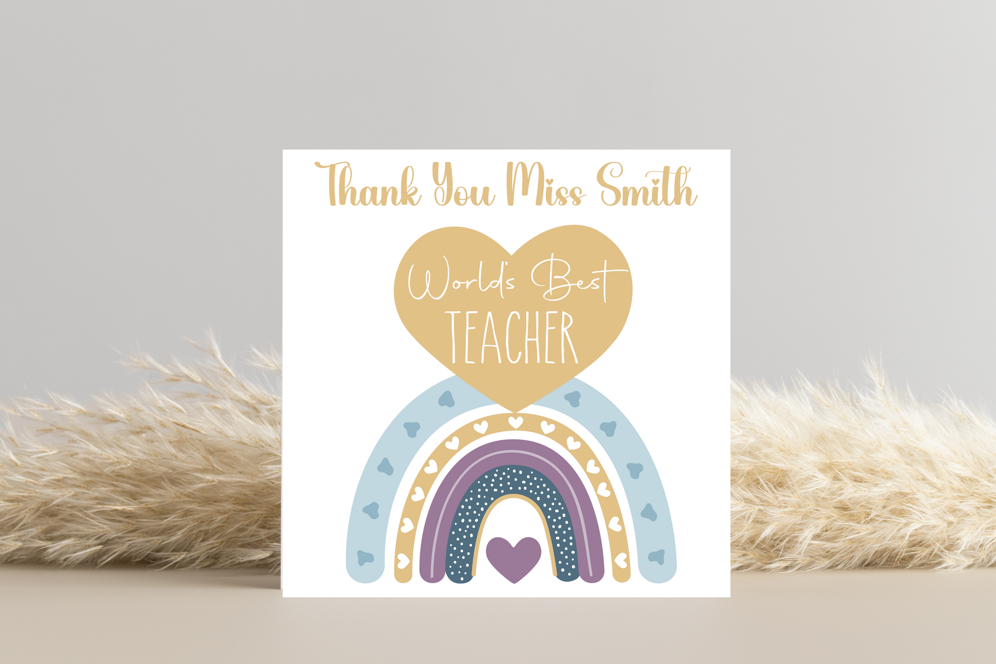 Show your appreciation for an amazing educator with our Personalised Worlds Best Teacher Card. Available for teachers, teaching assistants, TAs, and headteachers, this 6x6in card features a gold or purple design with a rainbow and writing in a heart. Perfect for end of school year thank yous!