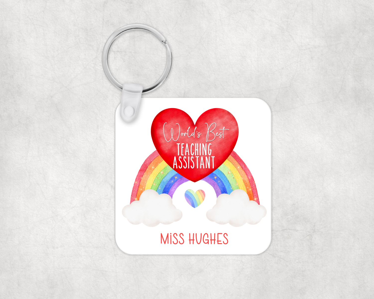 Brighten up any set of keys with this vibrant rainbow keyring that celebrates amazing Teaching Assistants! Featuring a cheerful design with "World's Best Teaching Assistant" nestled inside a bold red heart, this keyring can be personalised with a special name. A playful, colourful token of appreciation that's perfect for end-of-term gifts or just because they deserve it!