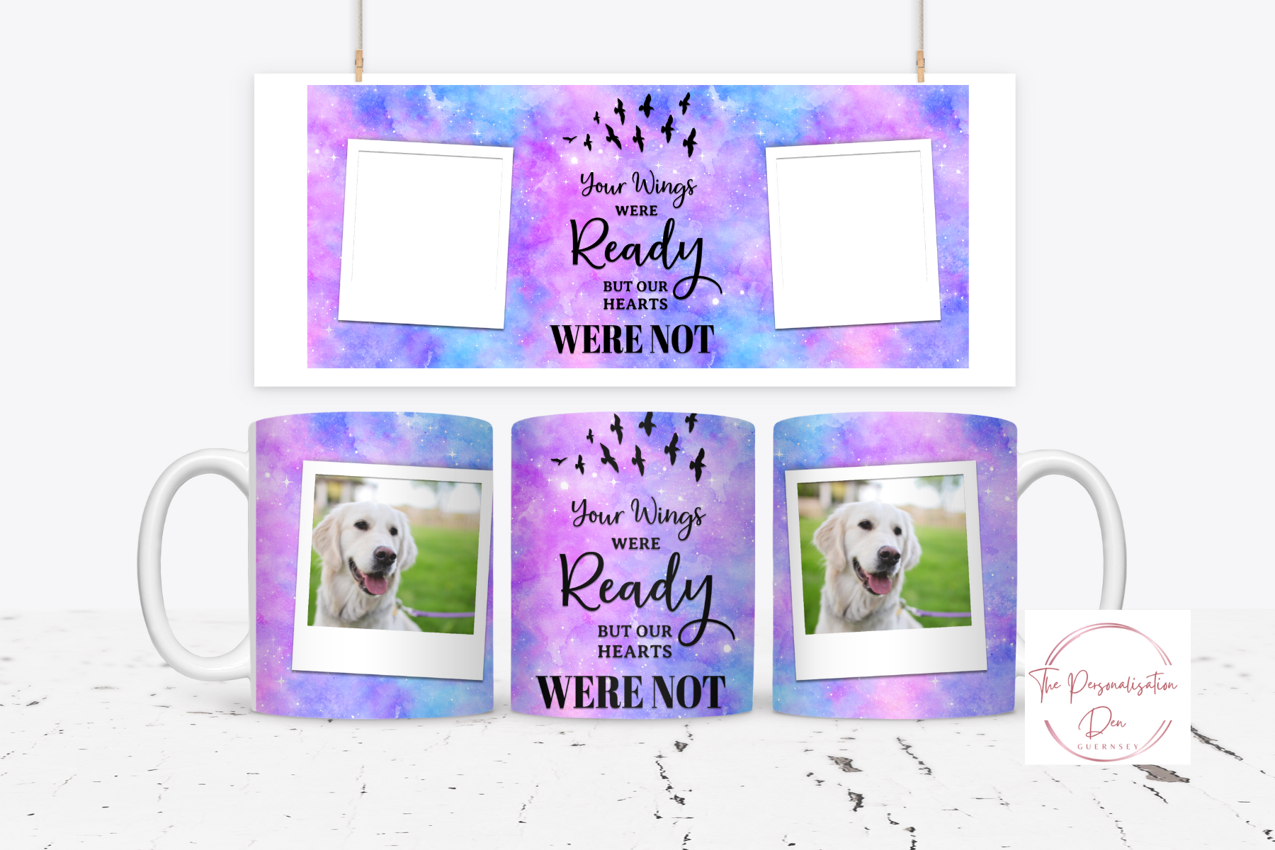 Honor your beloved pet with the Pet Memorial Photo Mug. Its touching "your wings were ready but our hearts will not" design in purple holds 2 photos of your furry friend. This 11oz mug is dishwasher and microwave safe. Because their memory deserves to be cherished!