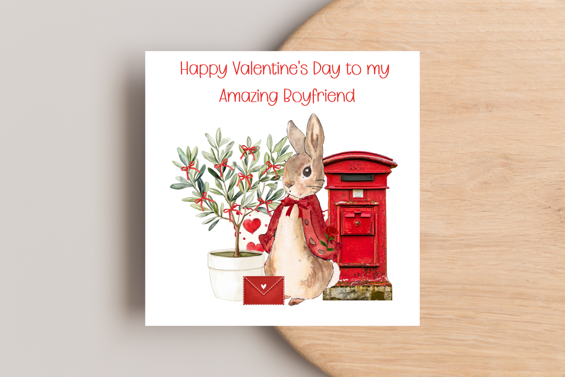 Celebrate love with a playful twist, Peter Rabbit style! Show your sweetheart how much they mean to you with this charming Valentine's Day card featuring a red postbox and roses design. Personalise your message to make it extra special. Hop into their heart with this delightful card!