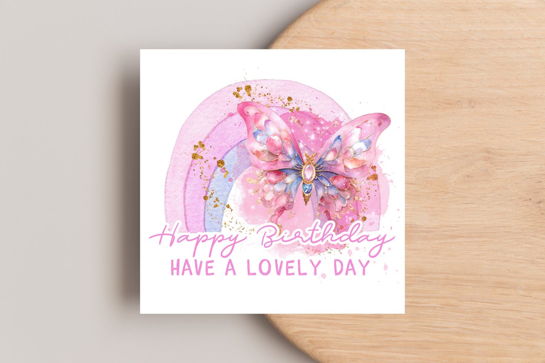 This Pink Butterfly Birthday Card features a beautiful design of pink butterflies against a pink rainbow, with a heartfelt "Happy Birthday, have a lovely day" message. A perfect way to show someone special how much they mean to you on their special day.