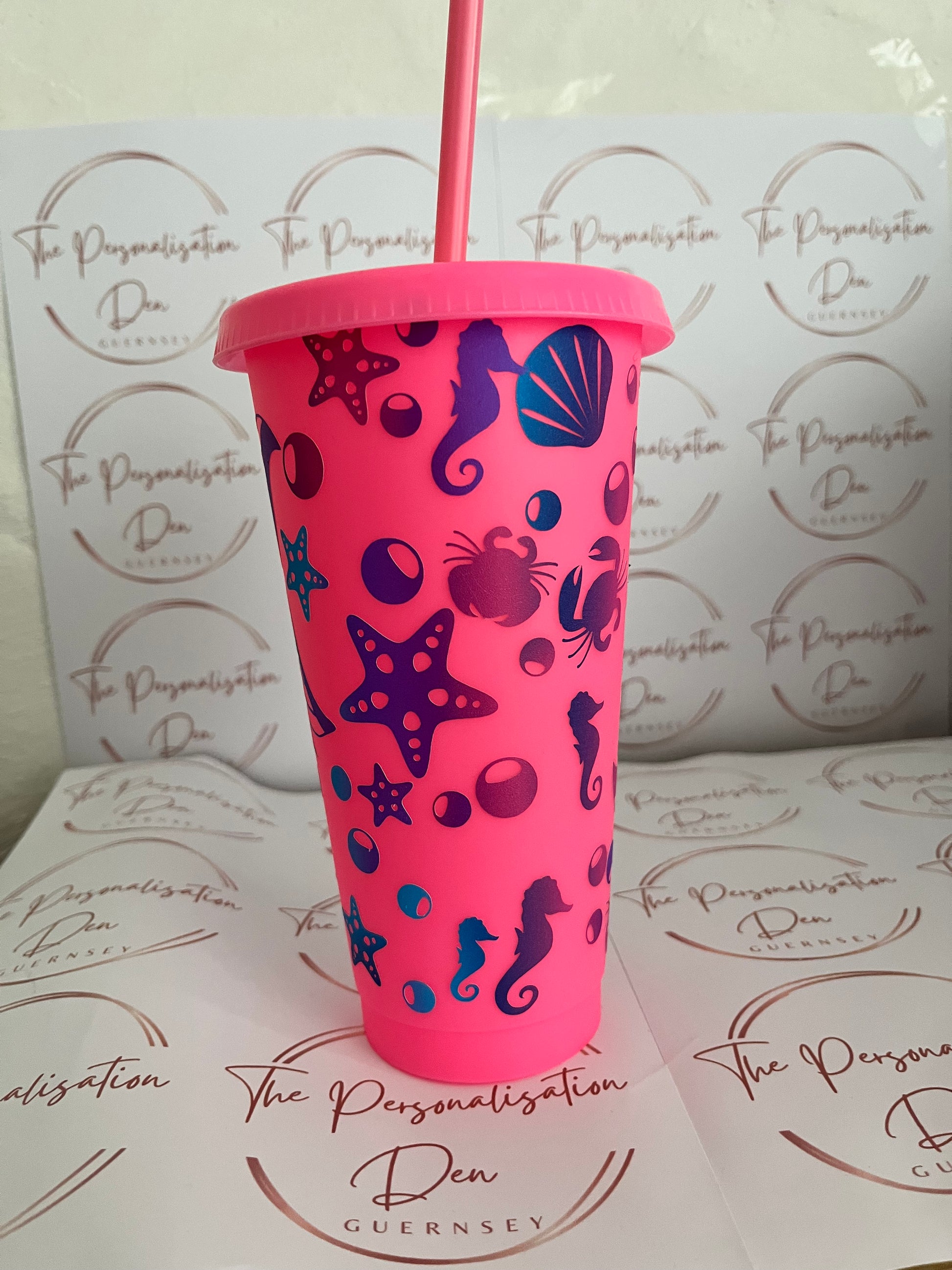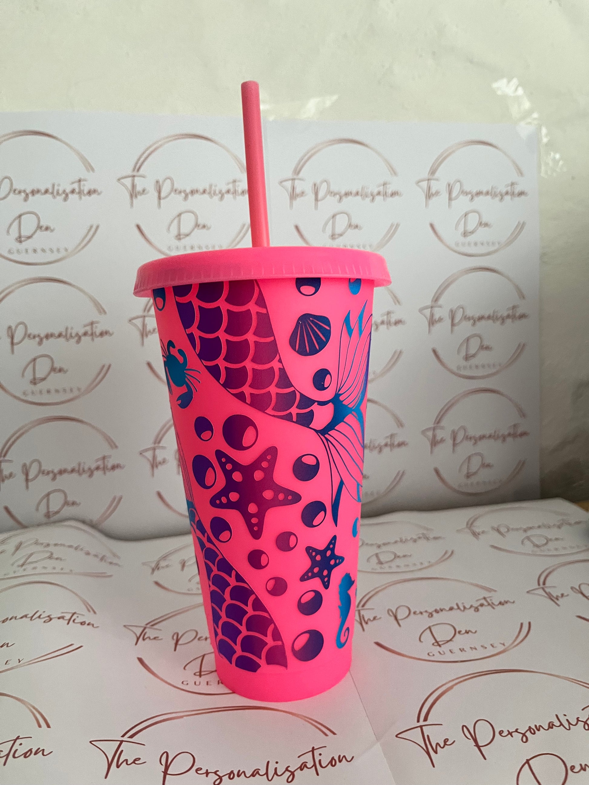 20oz pink cold cup. This cup features a mermaid design all the way around.