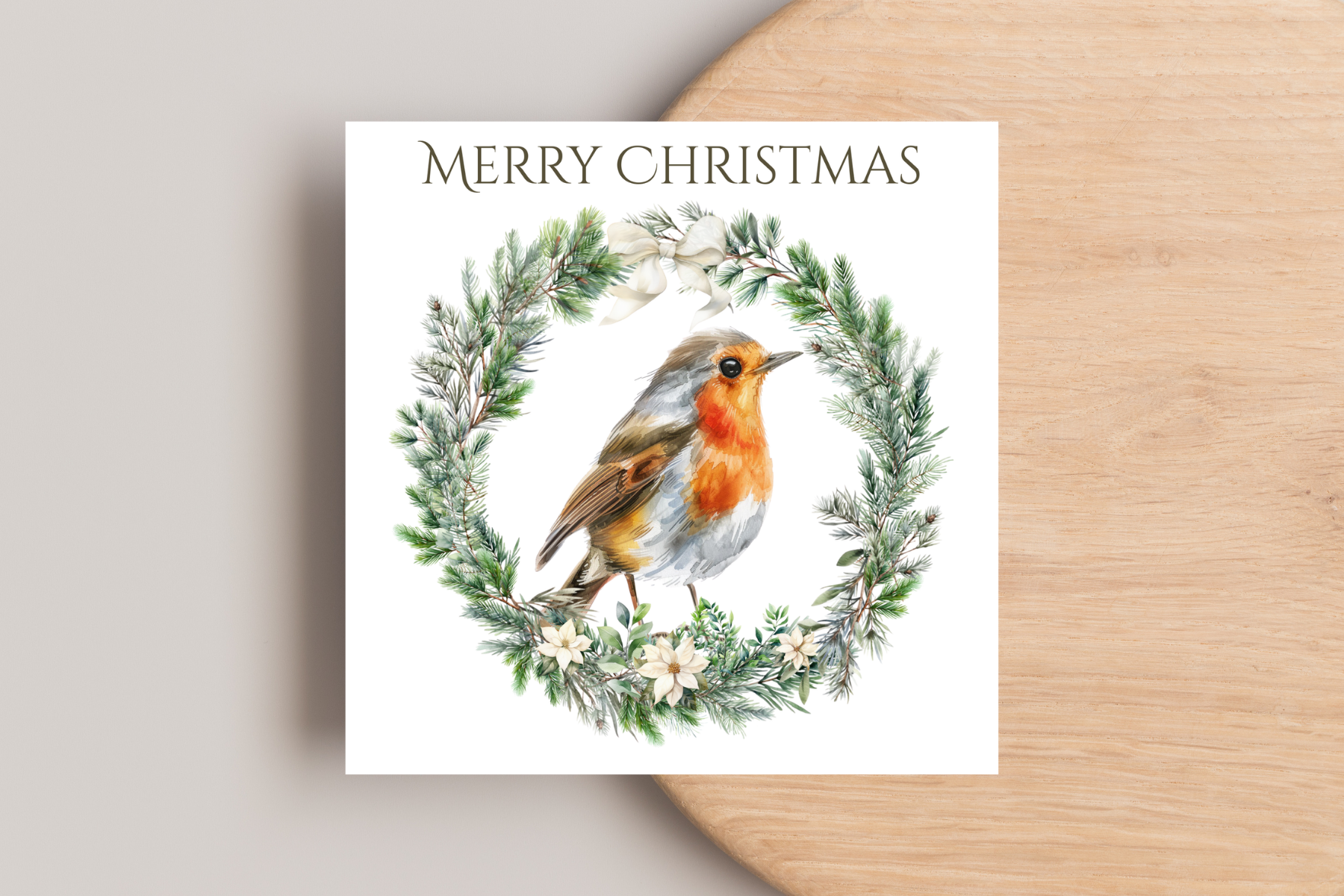Introducing our luxurious Robin Wreath Christmas Card, featuring an elegant robin nestled in a festive wreath. Bring joy and sophistication to your loved ones' holiday season with this premium card. Celebrate the beauty of nature and the spirit of giving with this exclusive design.