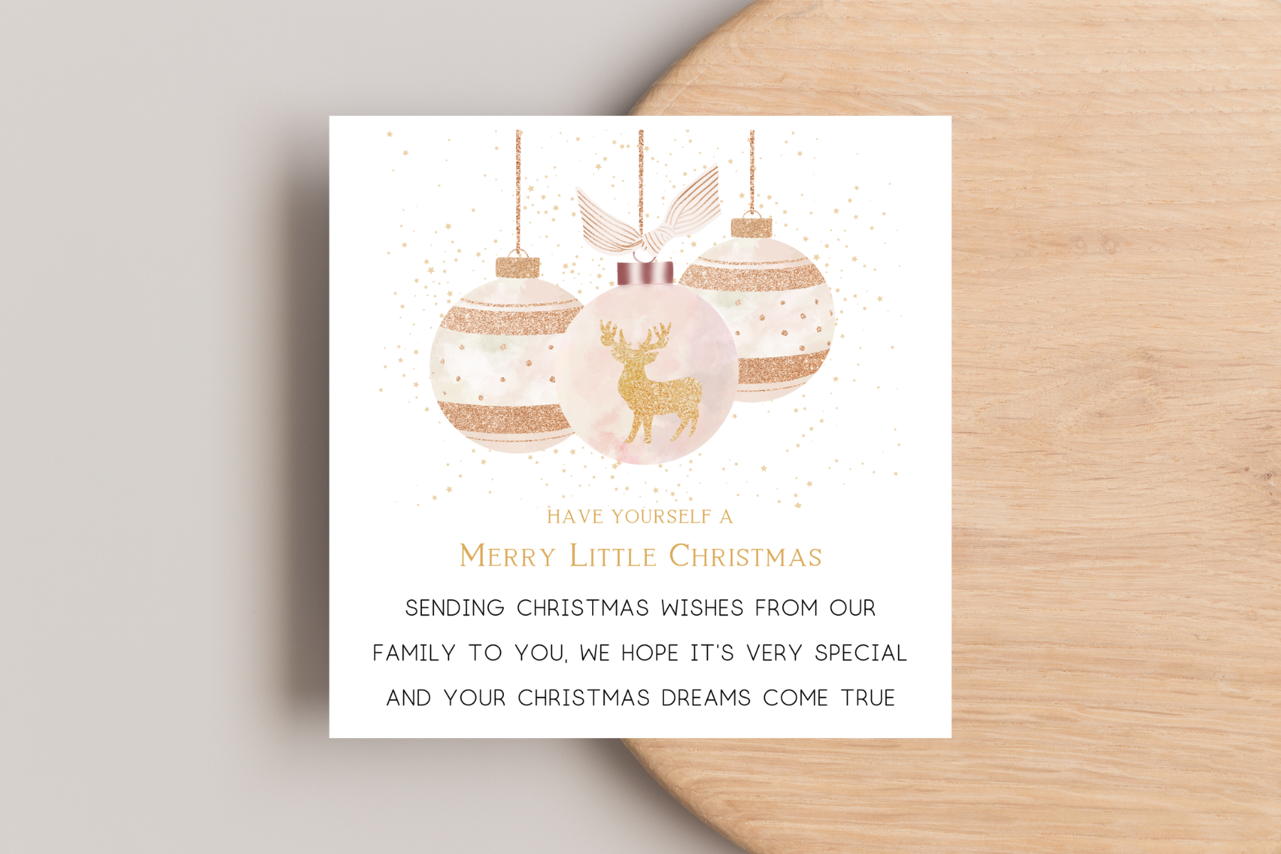 Send some festive cheer with our Reindeer Rose gold Bauble Christmas Wishes Card! At 6x6 inches, it’s big enough for all your heartfelt messages. Adorned with a merry reindeer, this card will make Santa jealous. Snag yours and let the reindeer games begin! 🎄✨