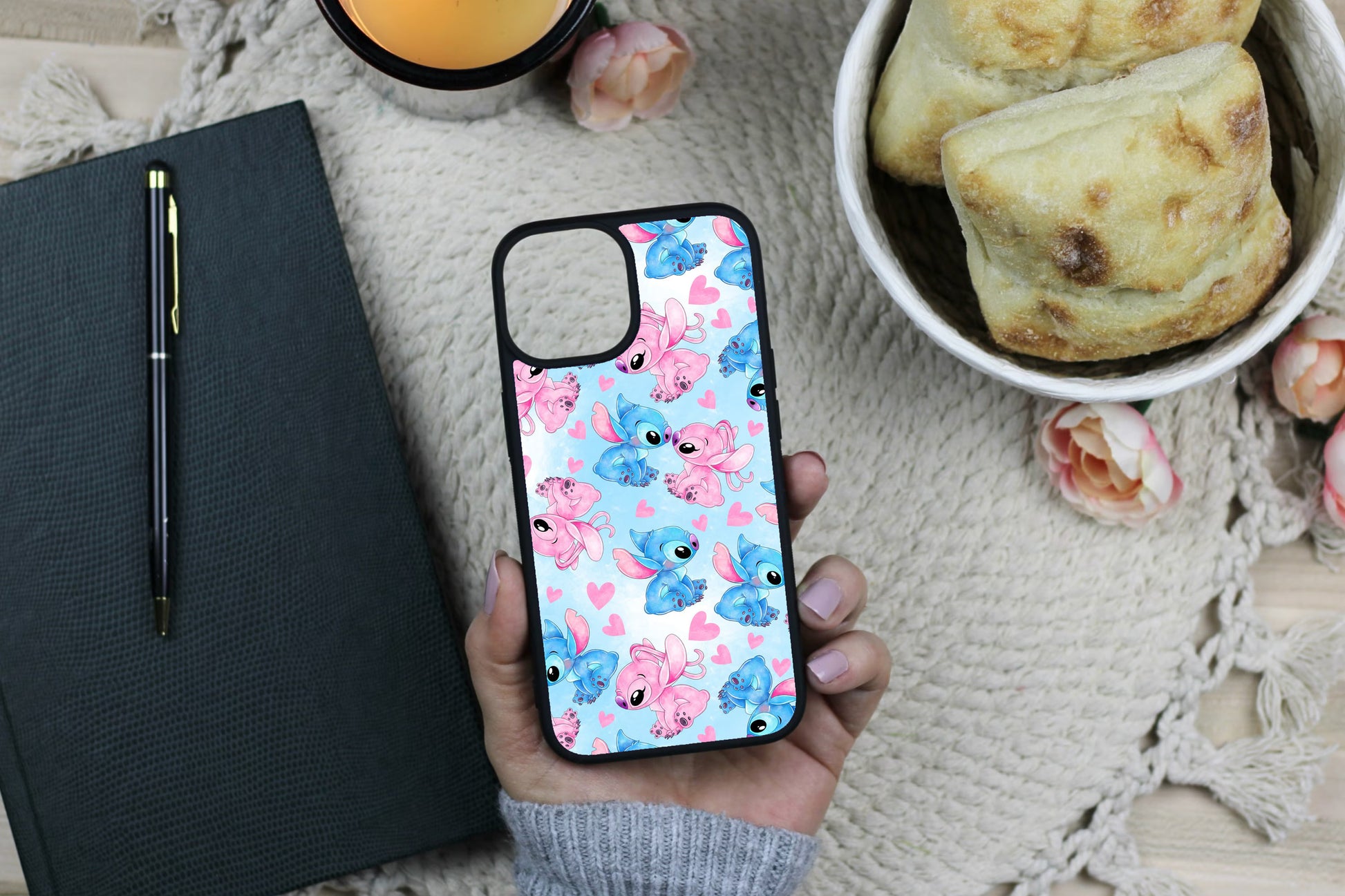 Bright colourful phone case covered with Pink and blue stitch and angel design
