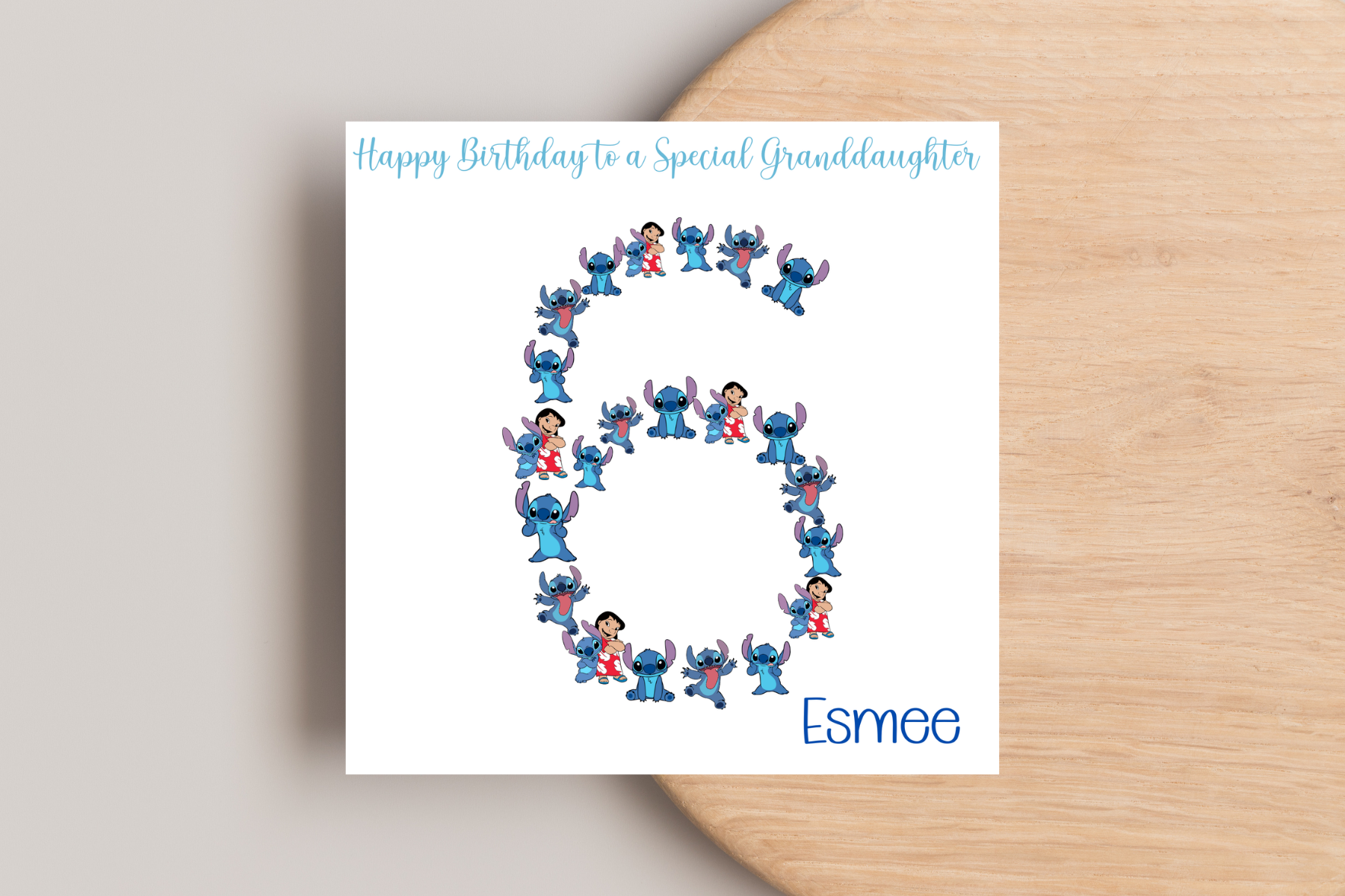 Celebrate your little one's 6th birthday in style with our Stitch themed birthday card! This personalised card features adorable Stitch images arranged in the shape of the number Make it extra special by adding a personal touch with your child's name. Perfect for any Disney fan, this unique birthday card is sure to bring a smile to their face.