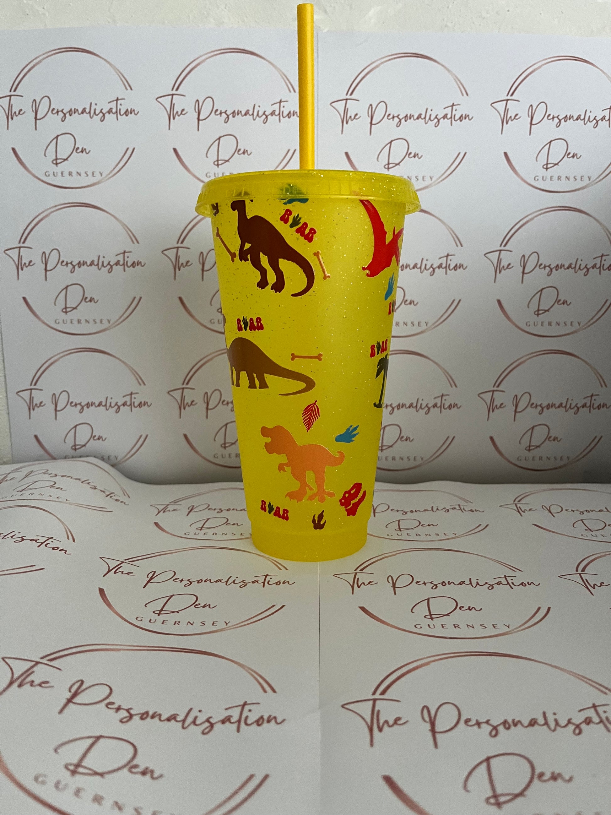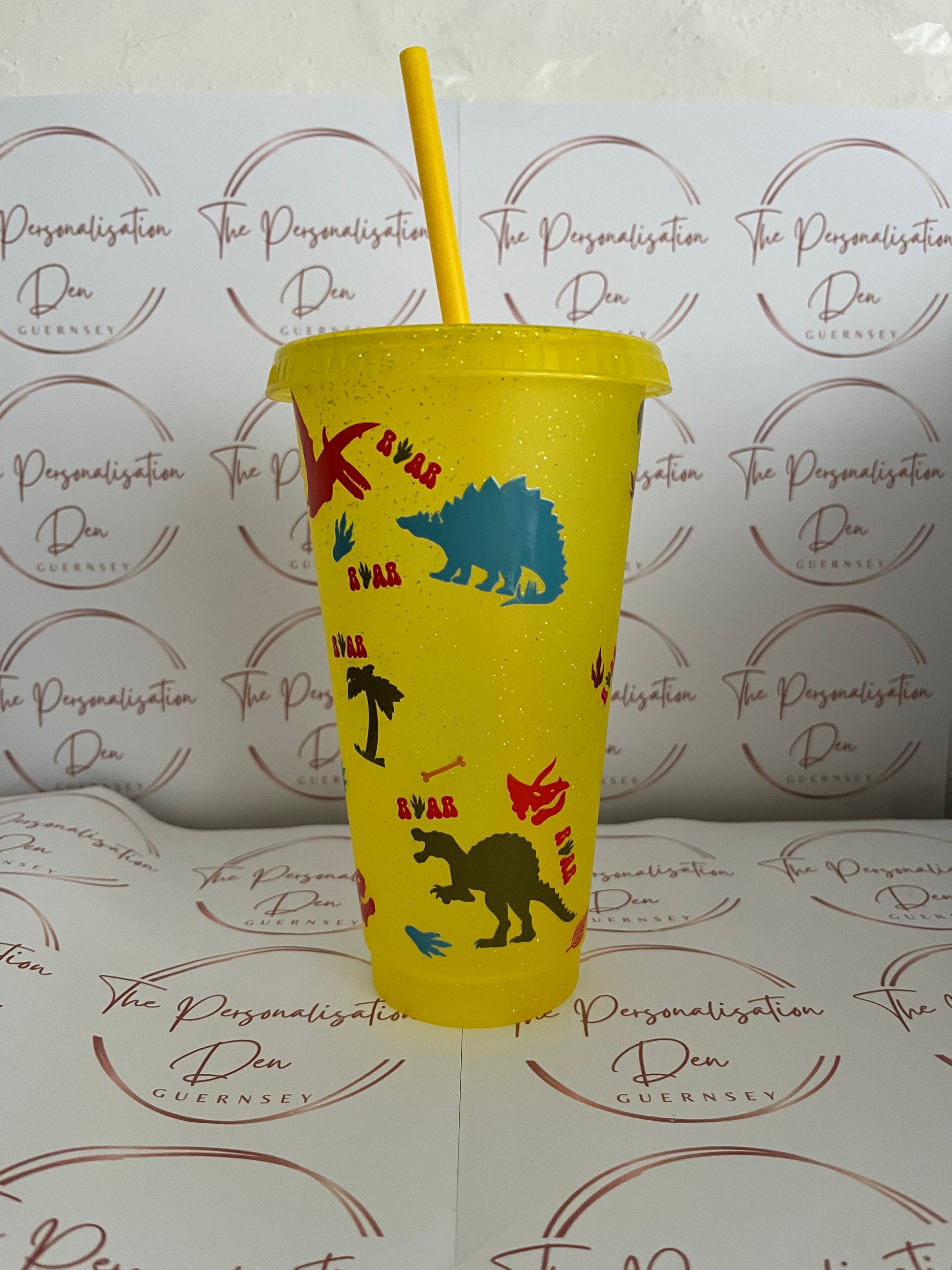 20oz yellow cold cup in a dinosaur theme. This cup is decorated with lots of dinosaurs and relating details such as bones, dinosaur eggs and ROAR!